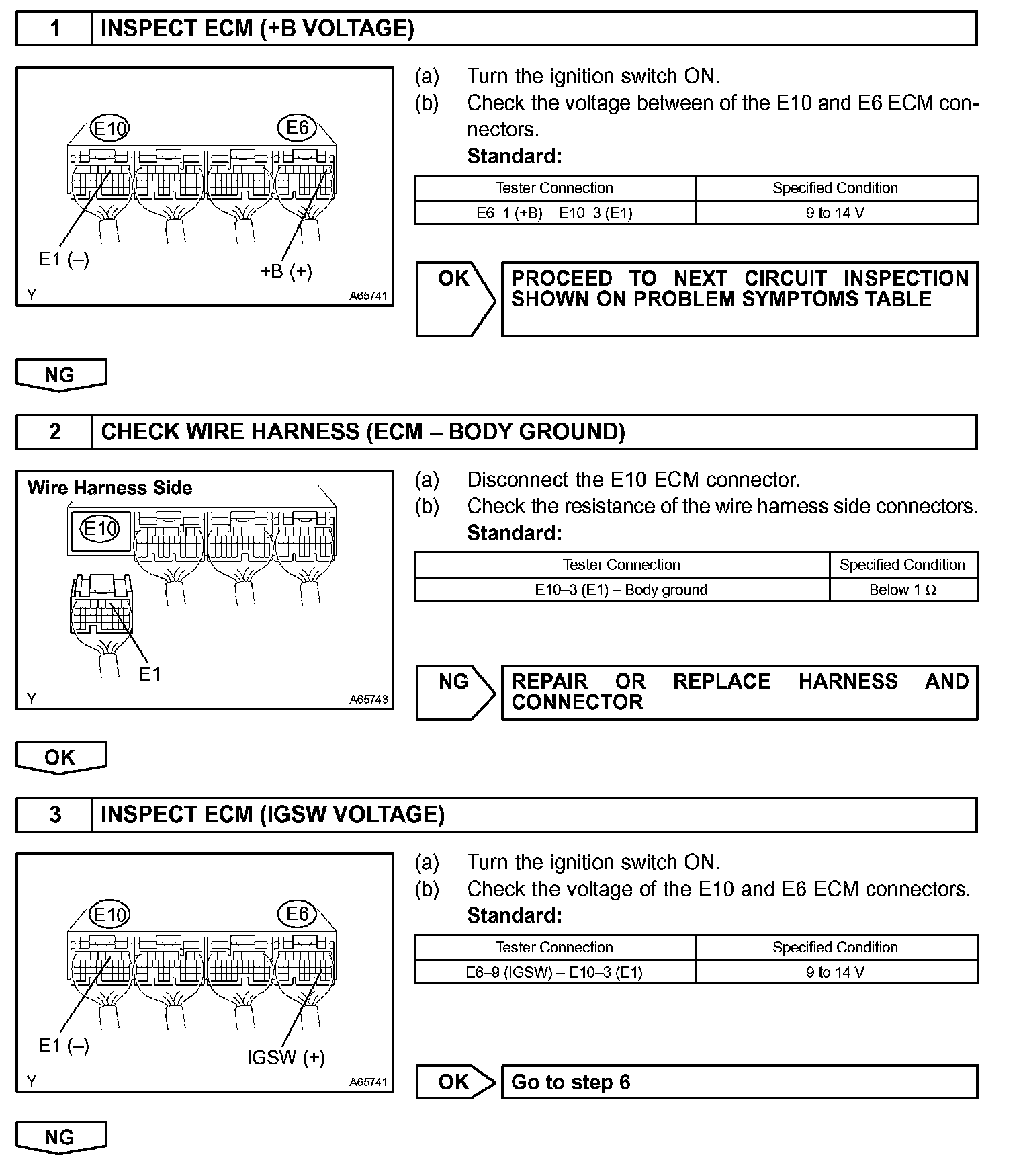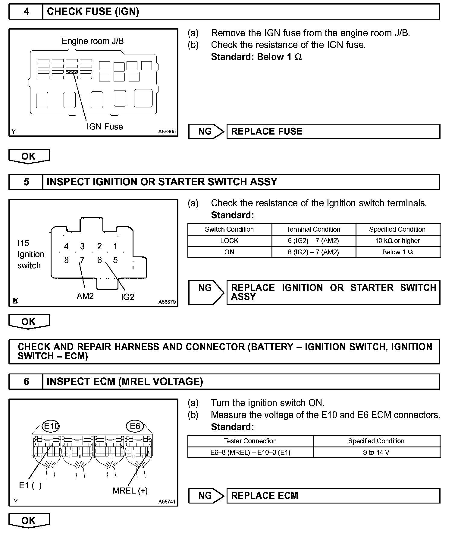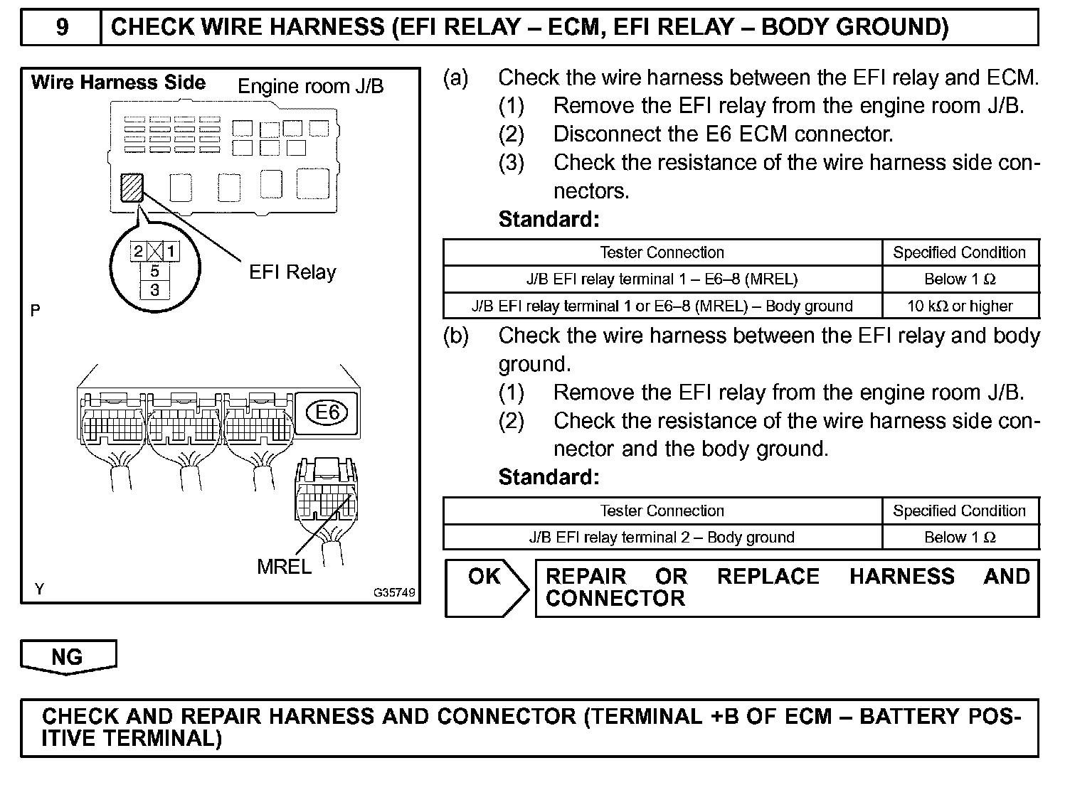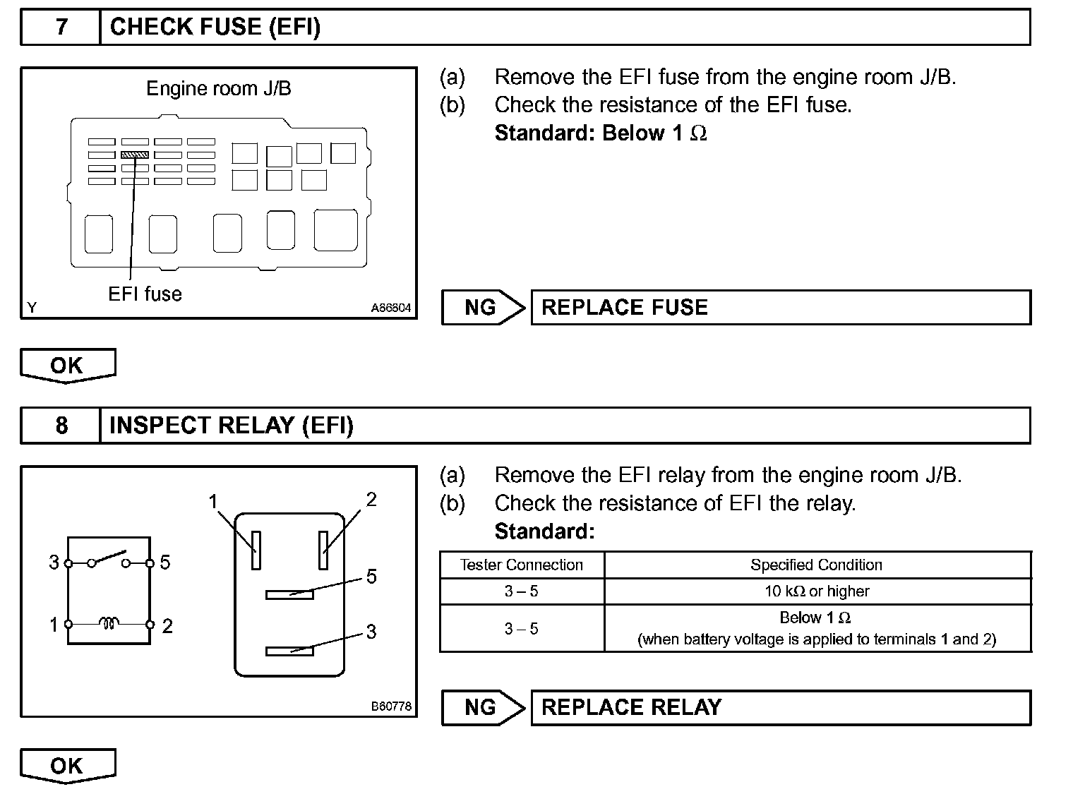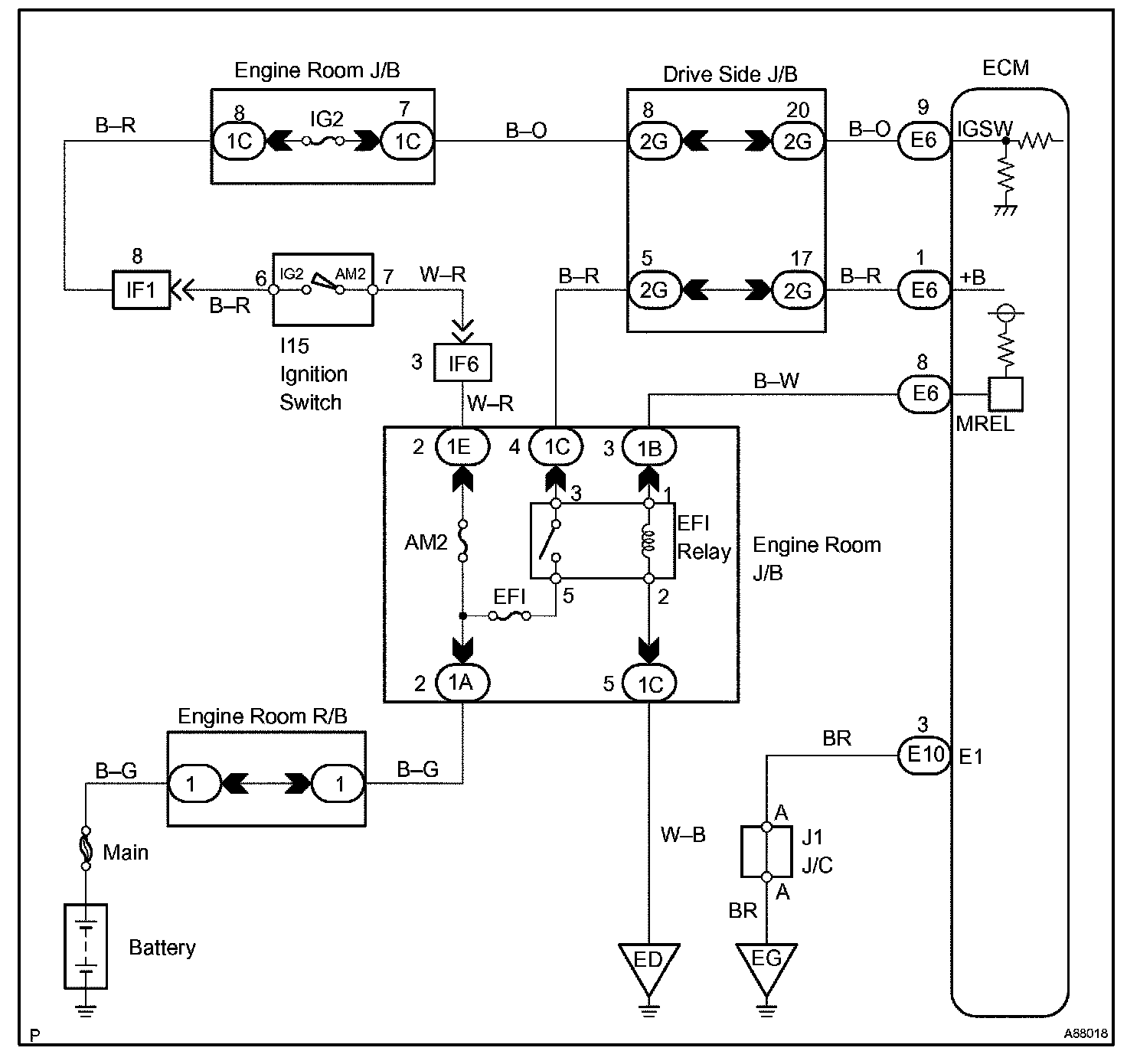 When the ignition switch is turned ON, battery voltage is applied to terminal IGSW of the ECM. The ECM "MREL" output signal causes current to flow to the coil, closing the contacts of the EFI relay (Marked: EFI) and supplying power to terminal +B of the ECM.