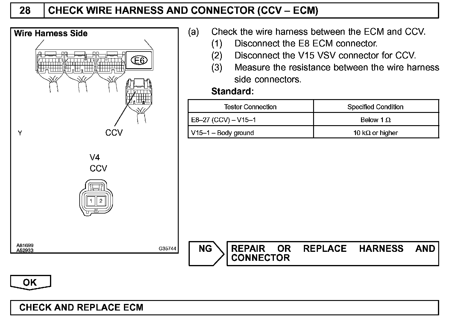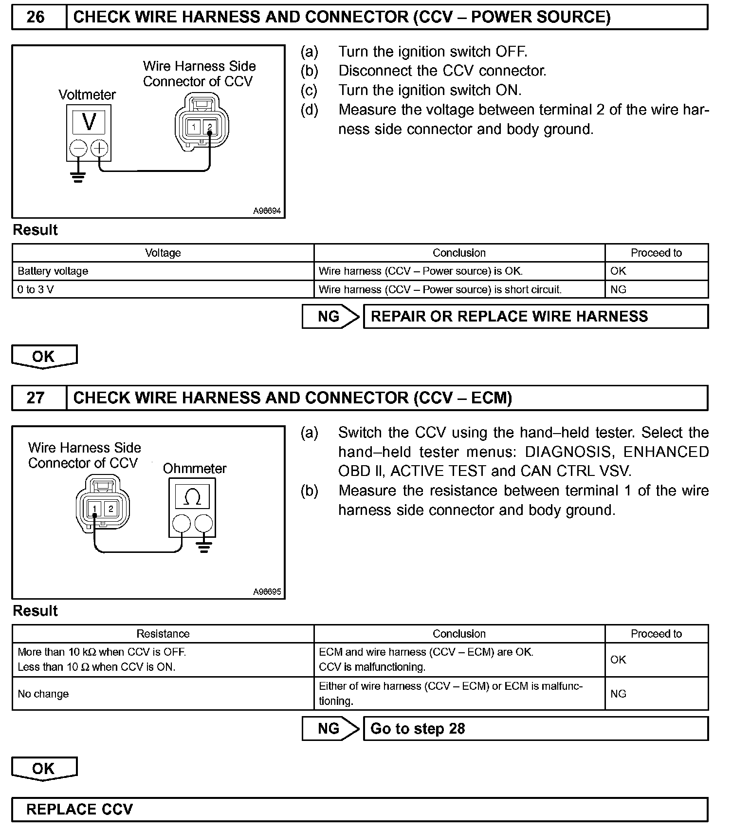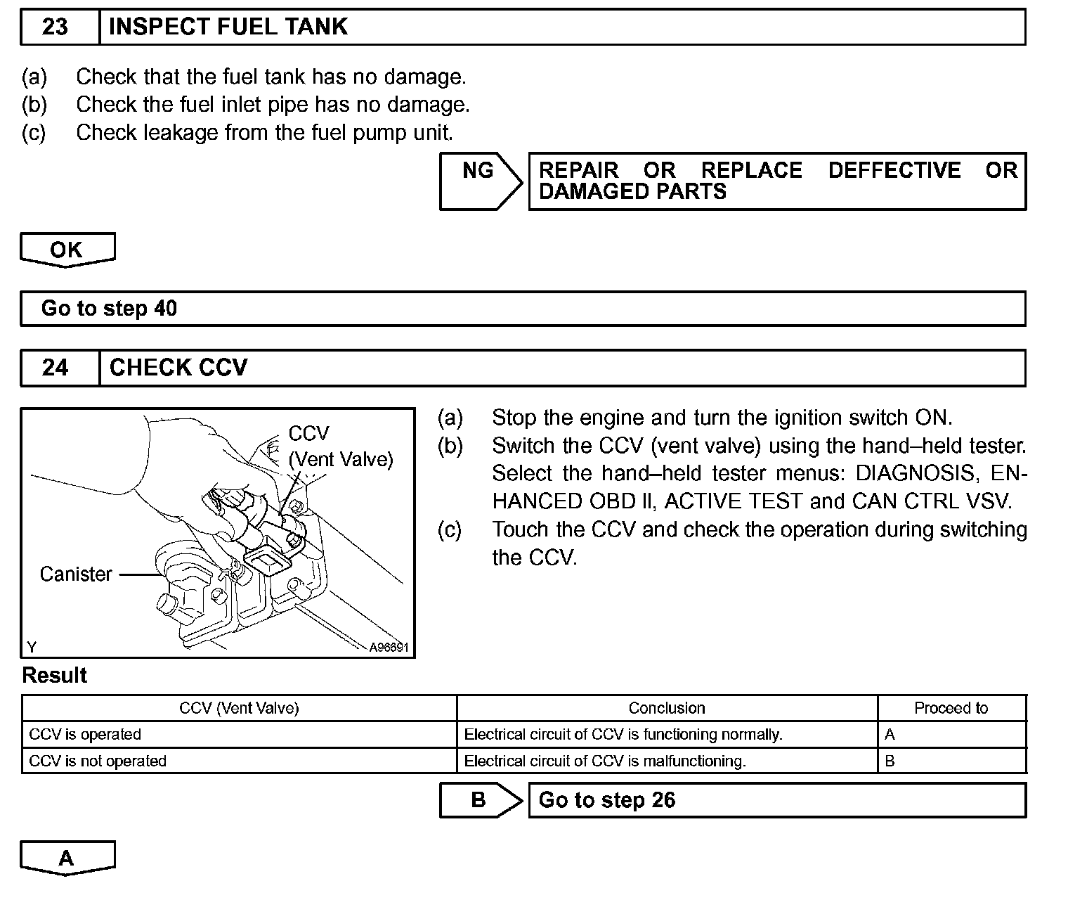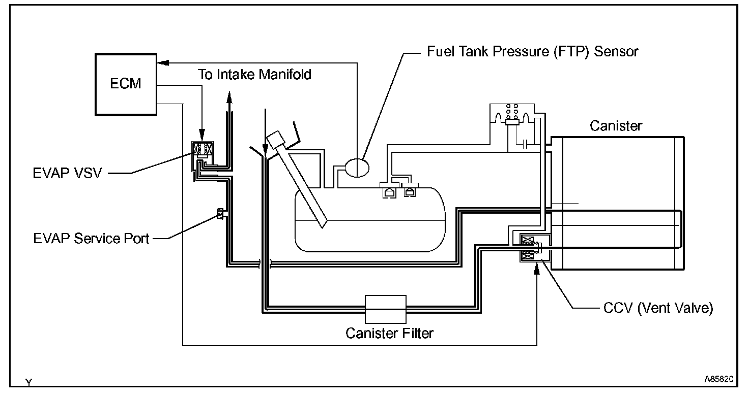 When predetermined conditions (closed loop, etc.) are met, the EVAP VSV is opened and stored fuel vapor in the canister is purged to the intake manifold. The ECM changes duty-cycle to the EVAP VSV to control purge flow volume. Purge flow volume is determined by the intake manifold pressure. Atmospheric pressure is allowed into the canister through the vent valve (CCV) to ensure that purge flow is maintained when negative pressure (vacuum) is applied to the canister. This EVAP system contains the components: