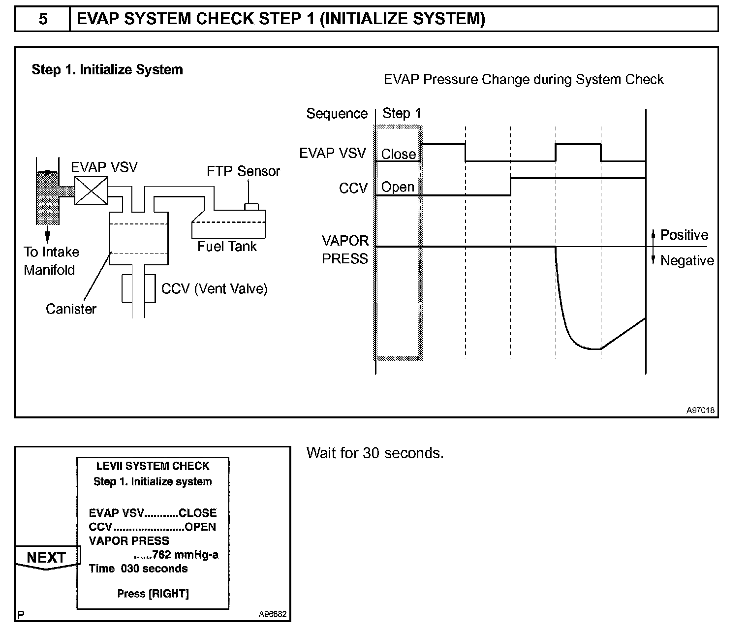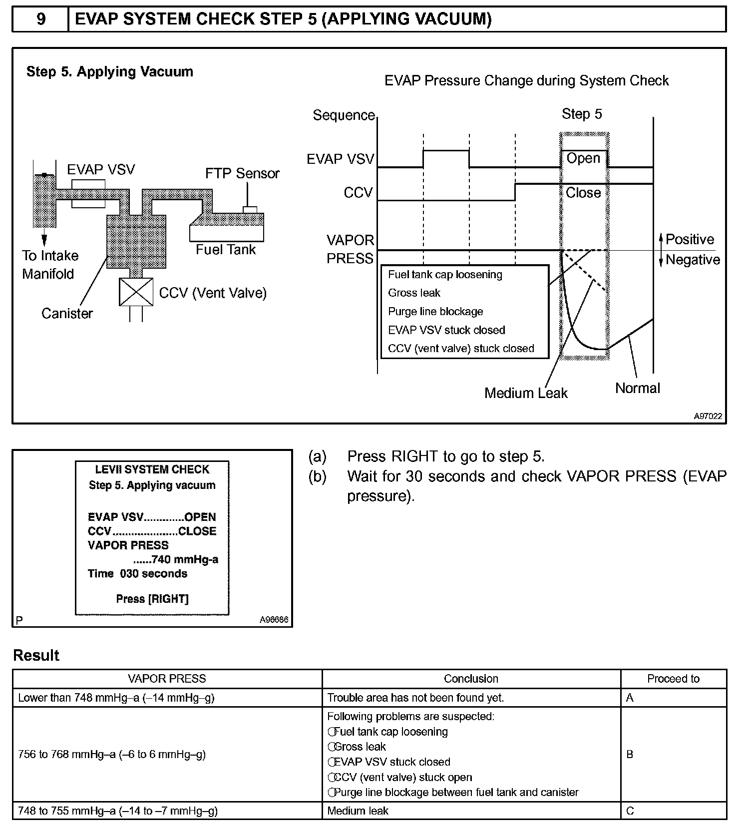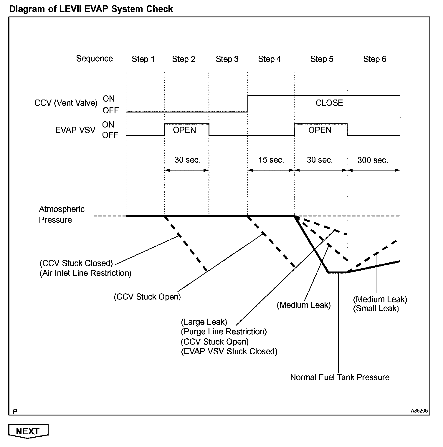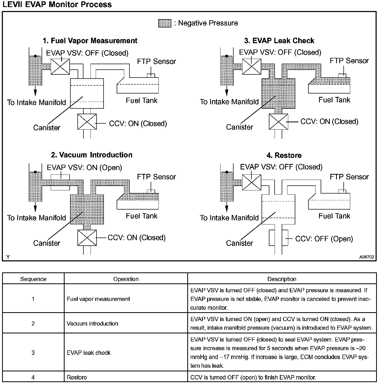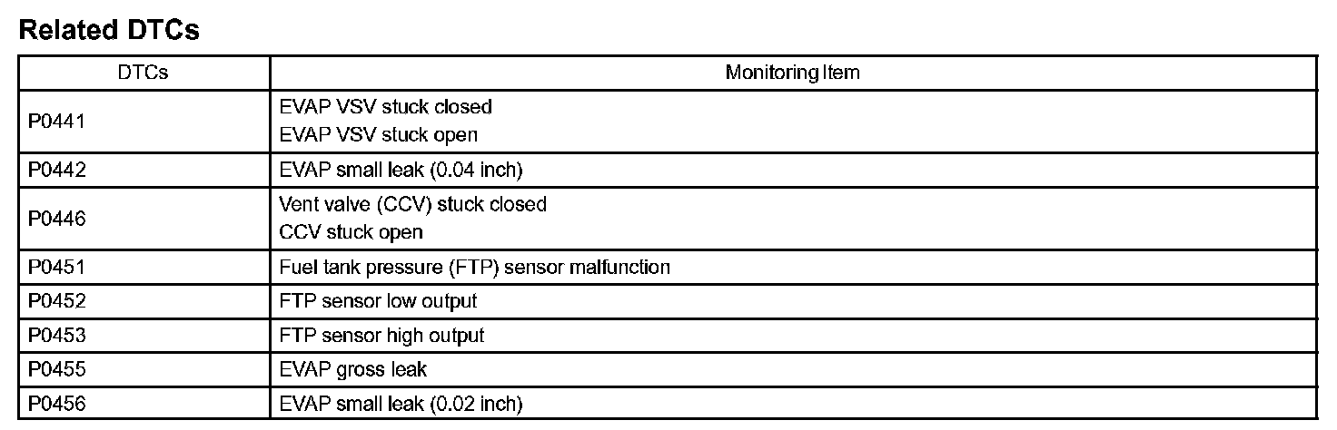 The EVAP monitor's purpose is to check for EVAP leaks and EVAP VSV and CCV malfunctions. The monitor performs the check by first introducing the intake manifold's negative pressure (vacuum) to the EVAP system. Then, the monitor records change in the EVAP system's pressure levels. The monitor runs when the following conditions are met: