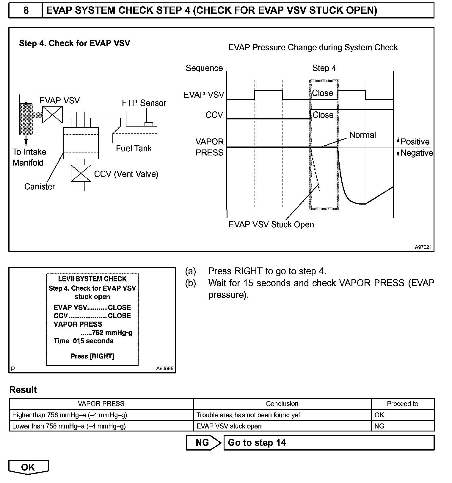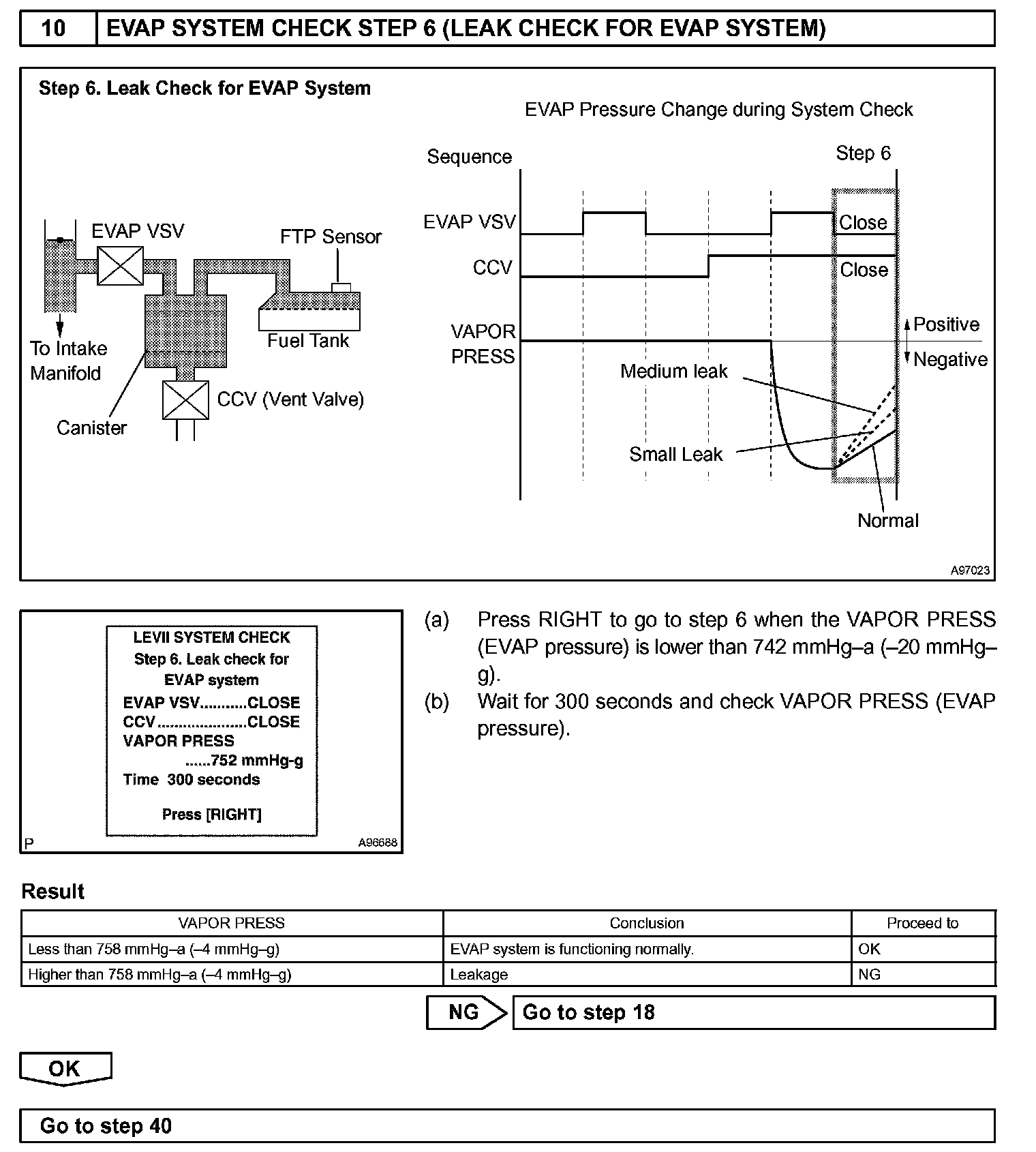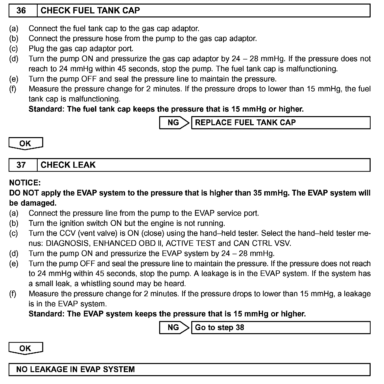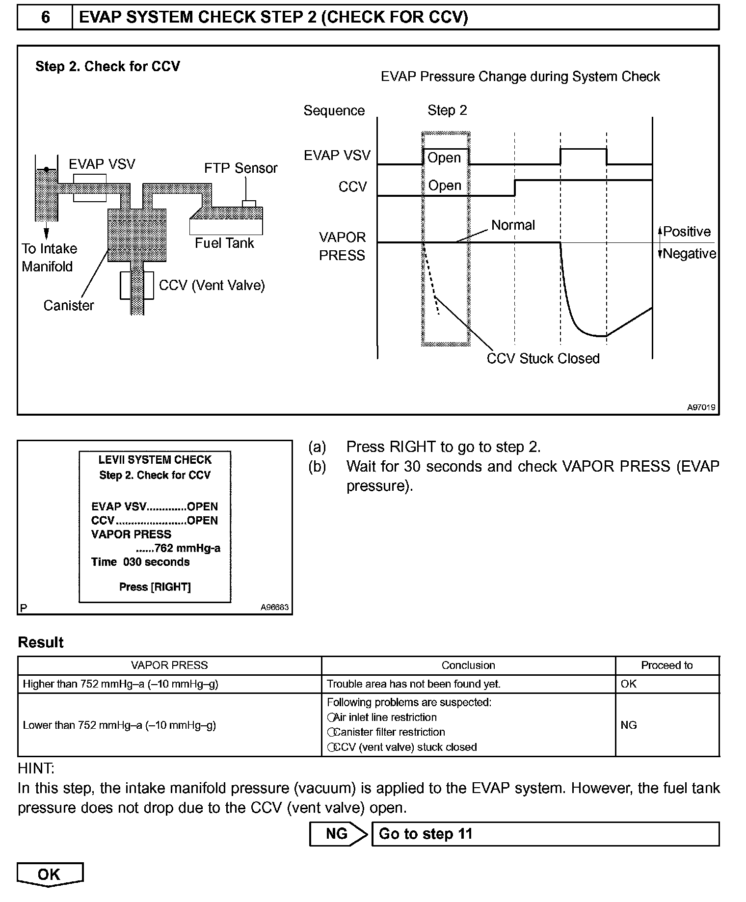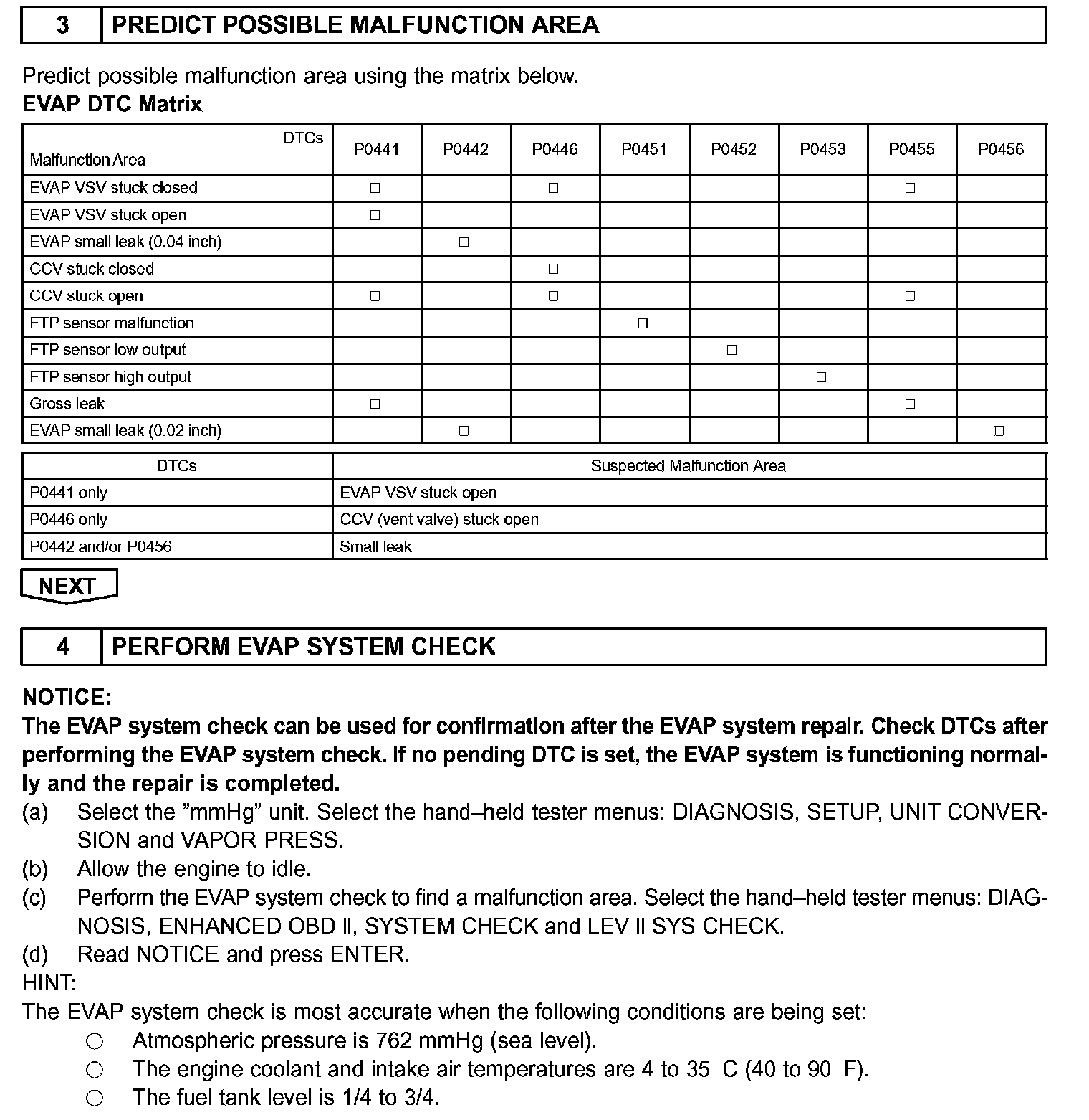 The EVAP monitor's purpose is to check for EVAP leaks and EVAP VSV and CCV malfunctions. The monitor performs the check by first introducing the intake manifold's negative pressure (vacuum) to the EVAP system. Then, the monitor records change in the EVAP system's pressure levels. The monitor runs when the following conditions are met: