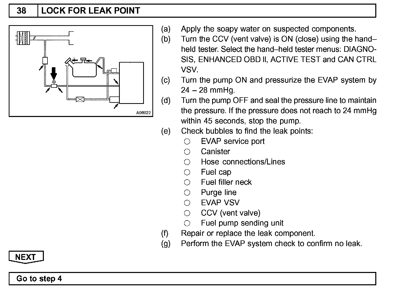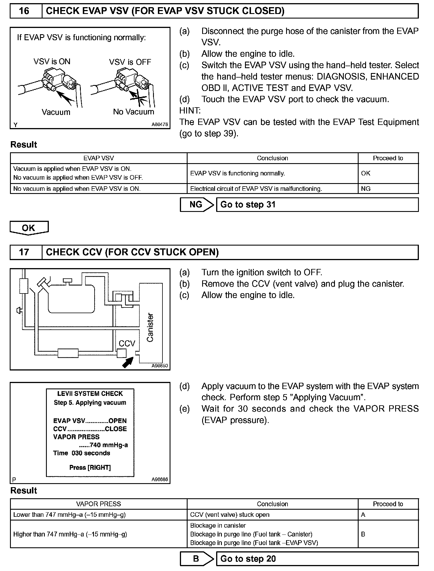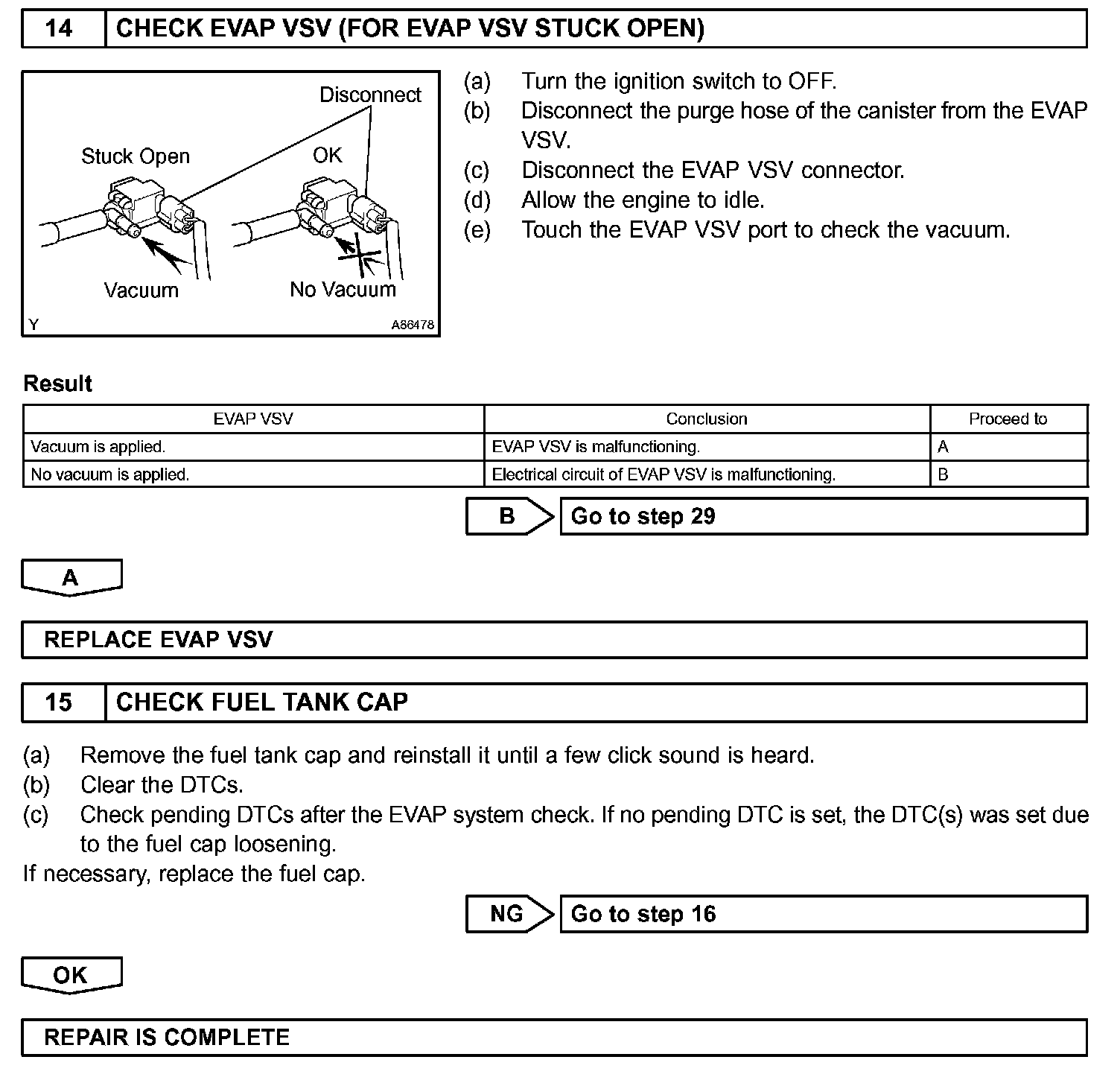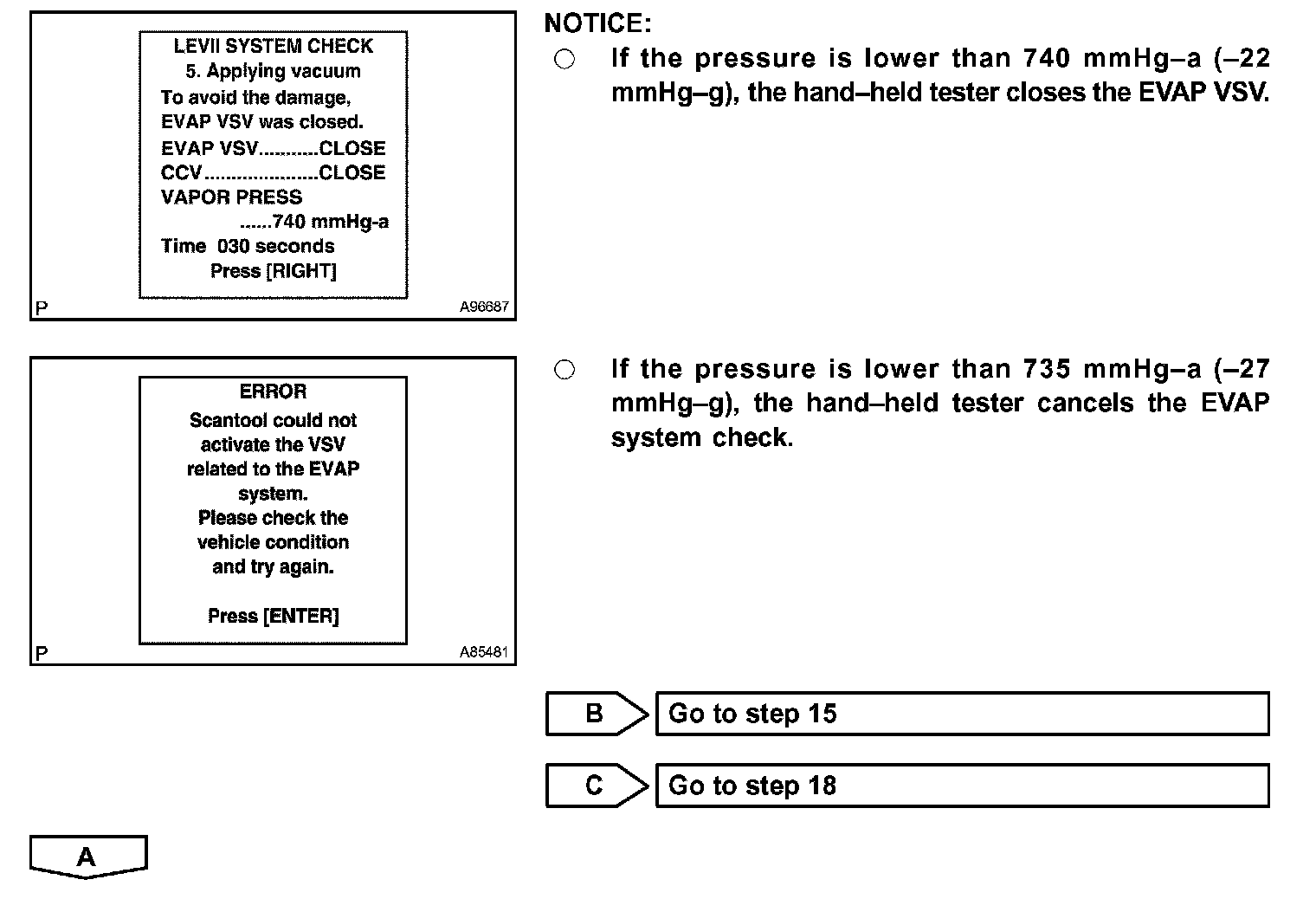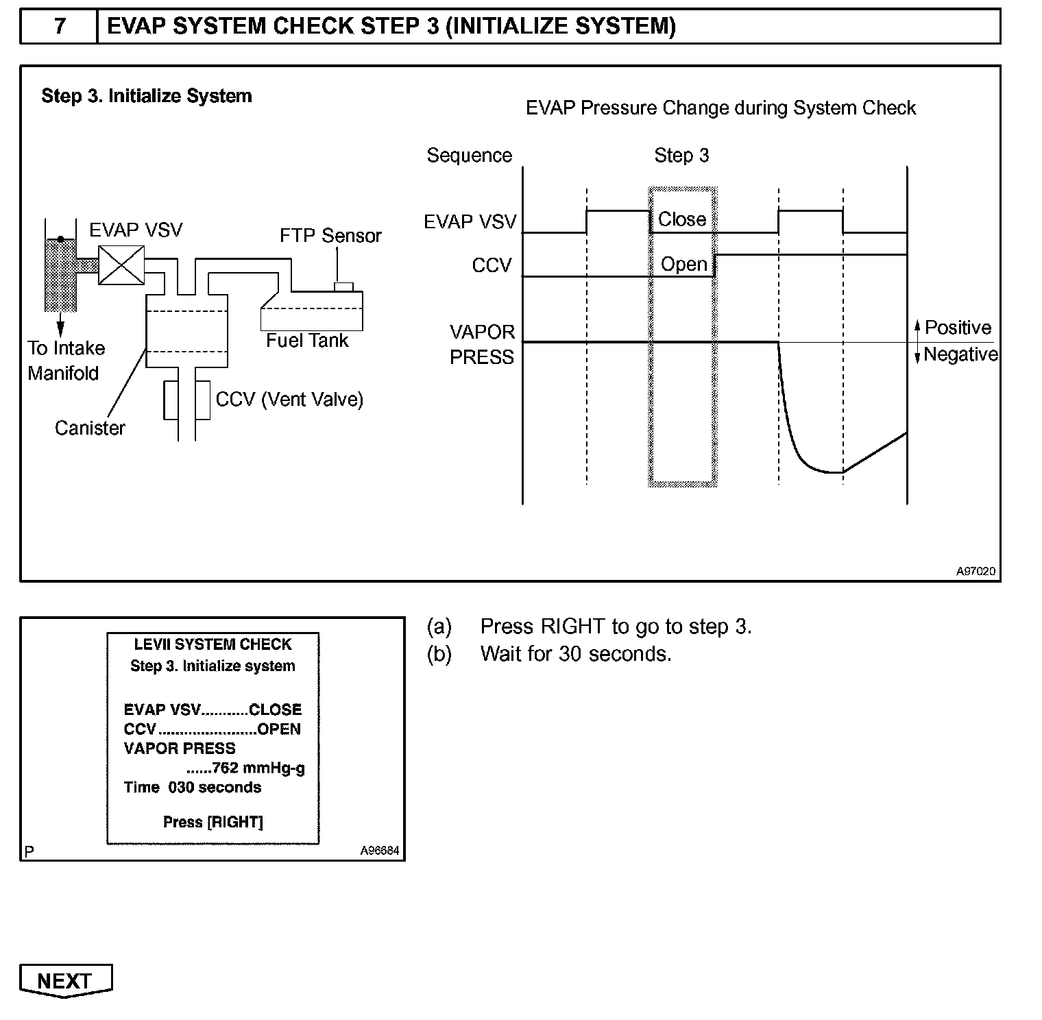The EVAP monitor's purpose is to check for EVAP leaks and EVAP VSV and CCV malfunctions. The monitor performs the check by first introducing the intake manifold's negative pressure (vacuum) to the EVAP system. Then, the monitor records change in the EVAP system's pressure levels. The monitor runs when the following conditions are met: