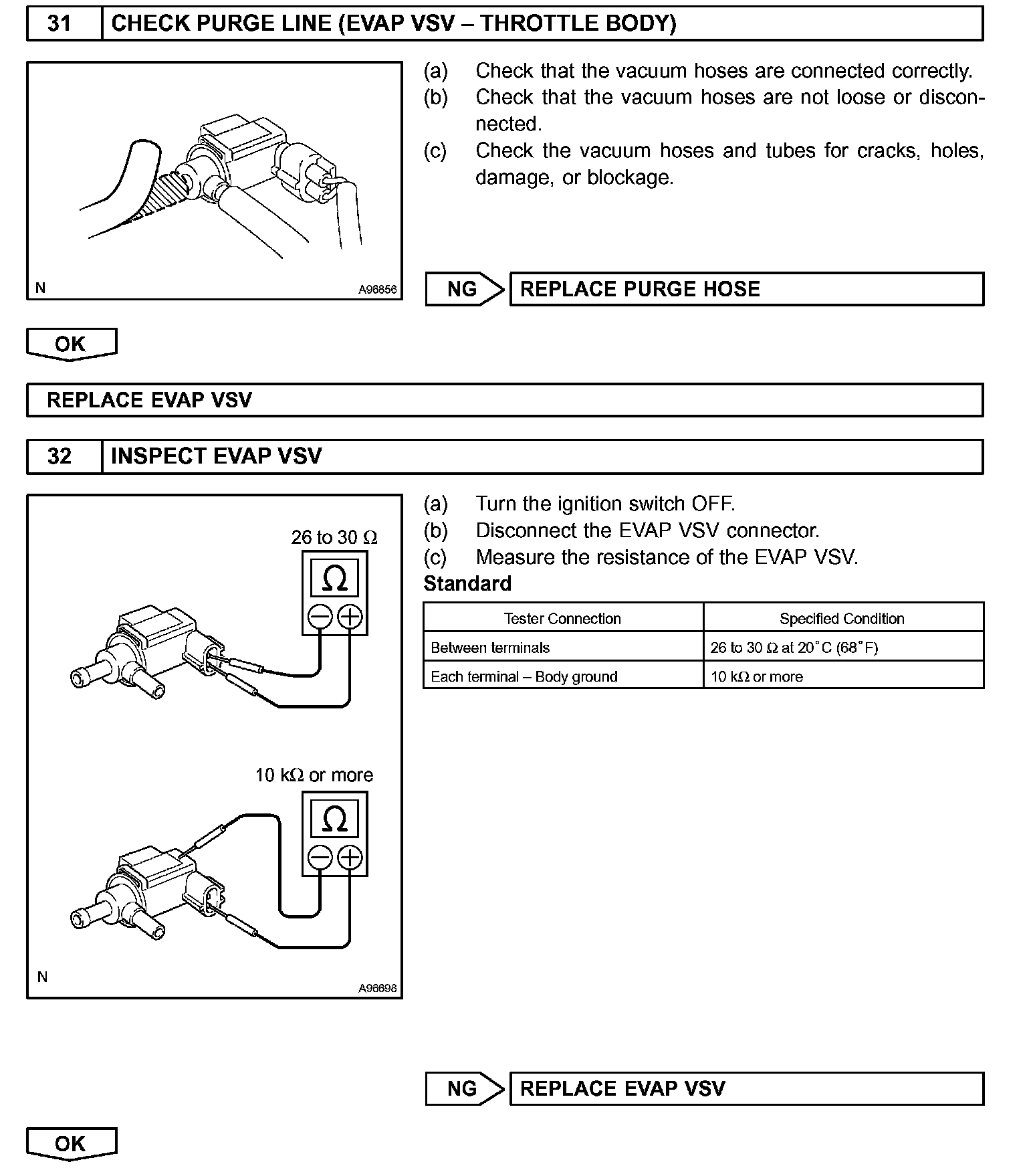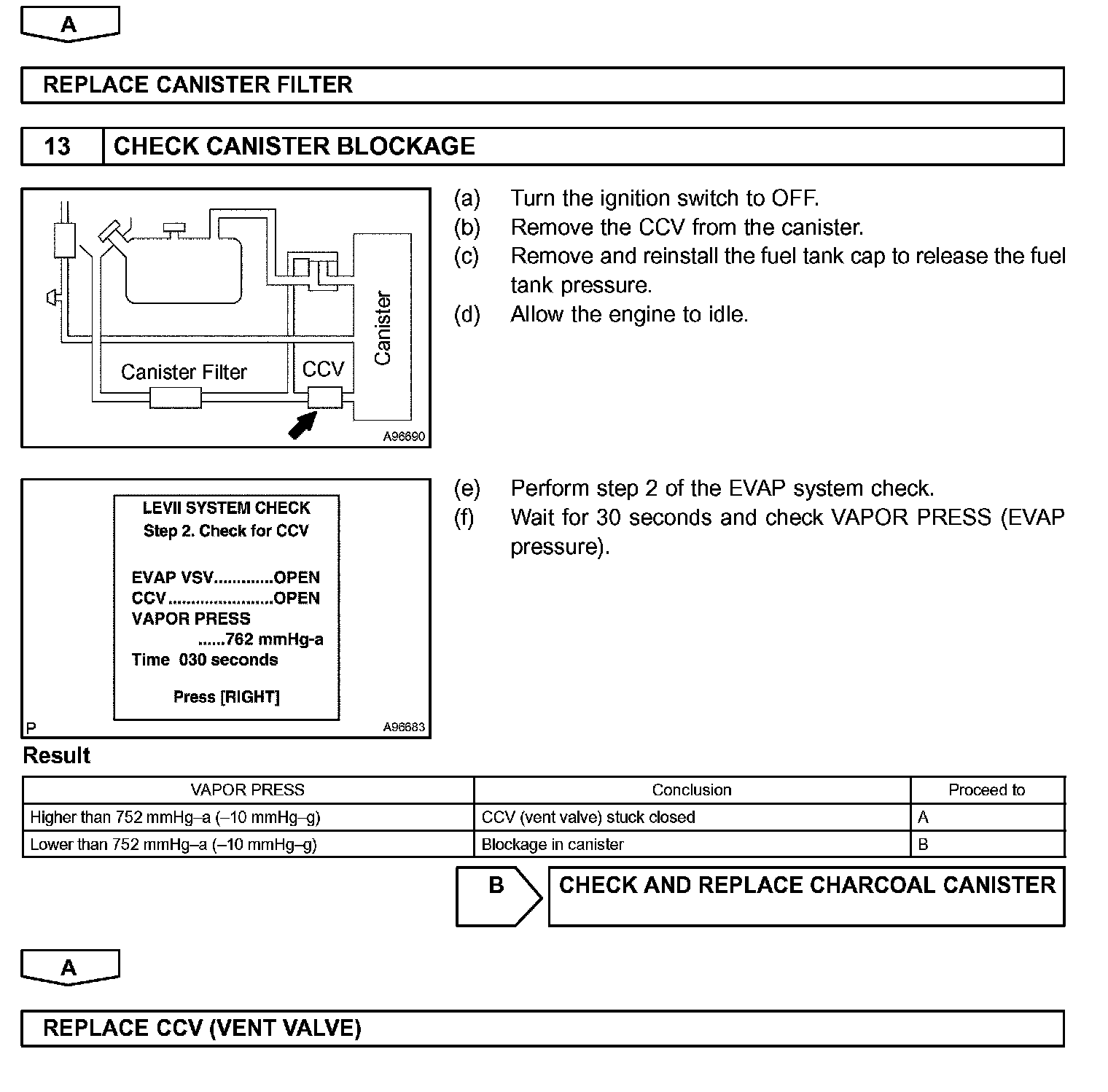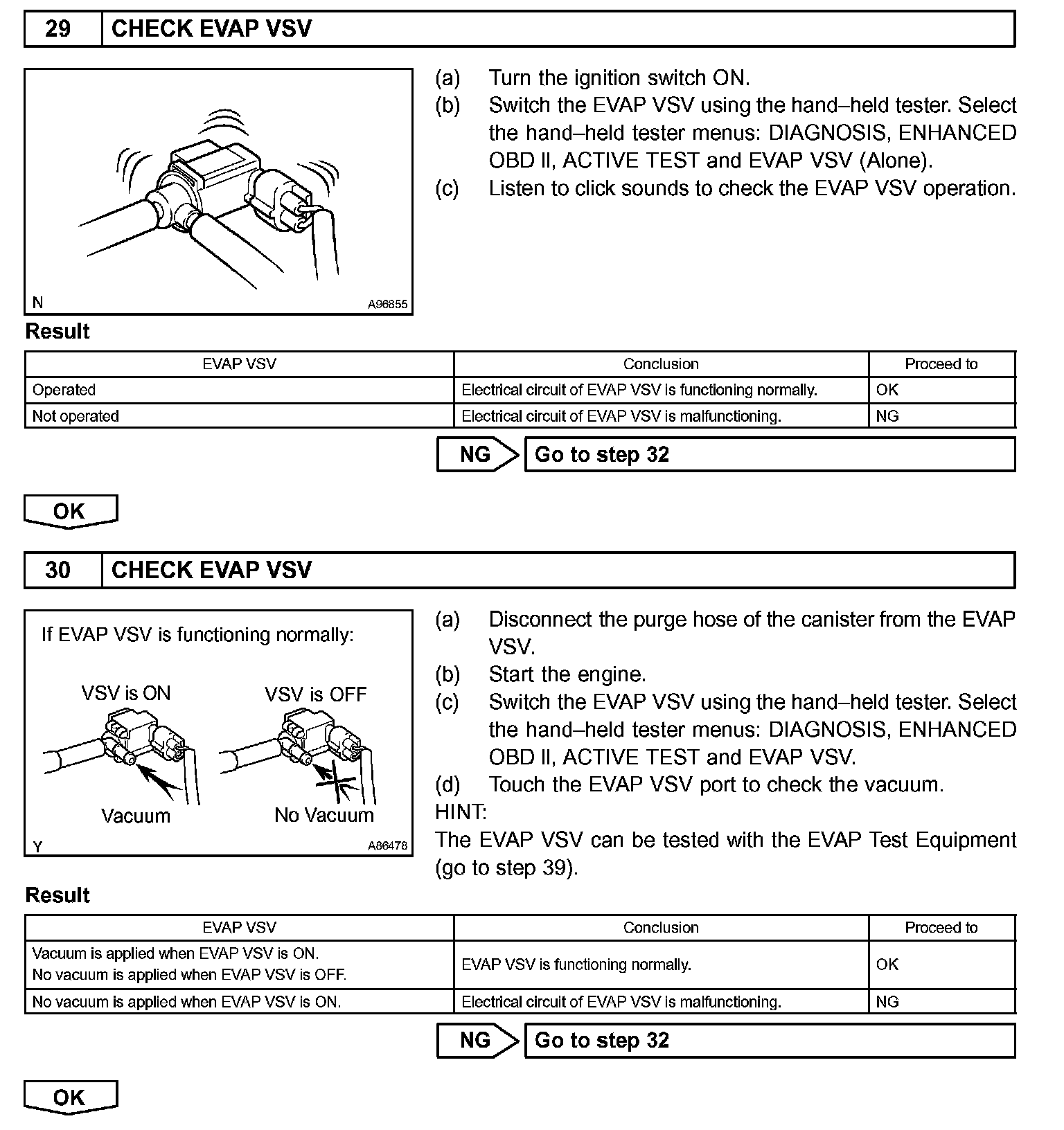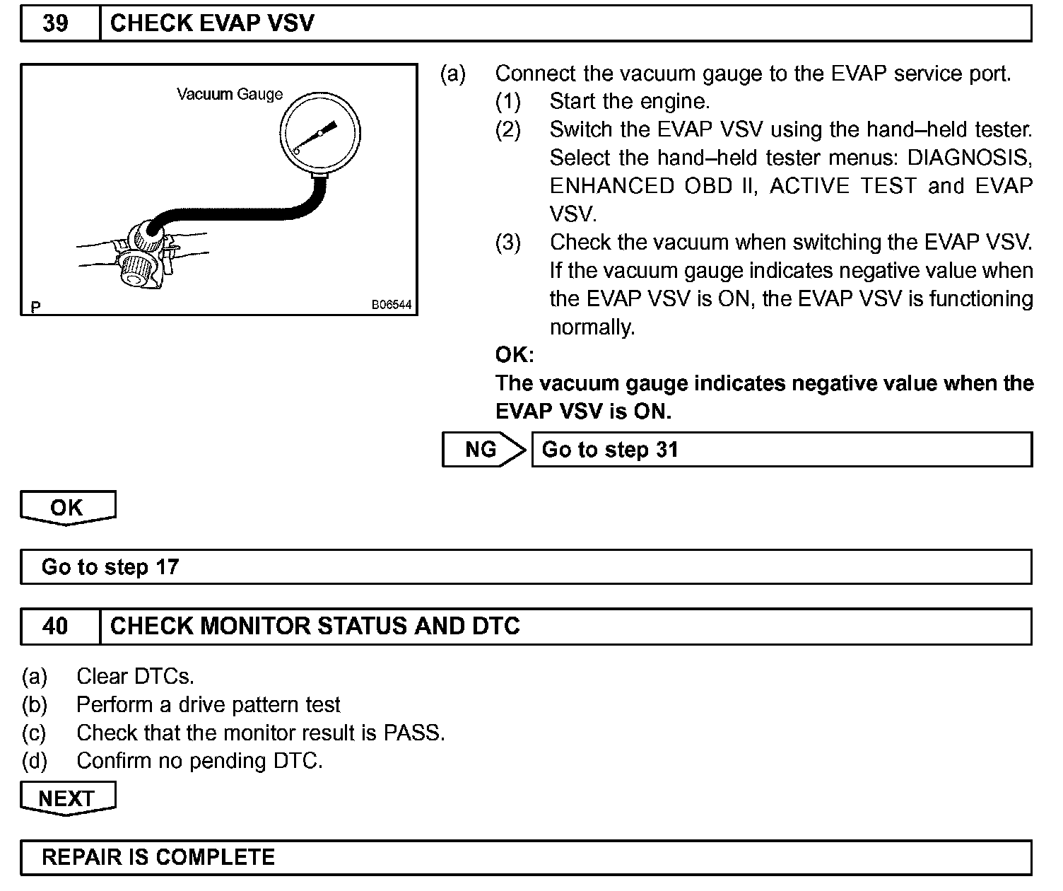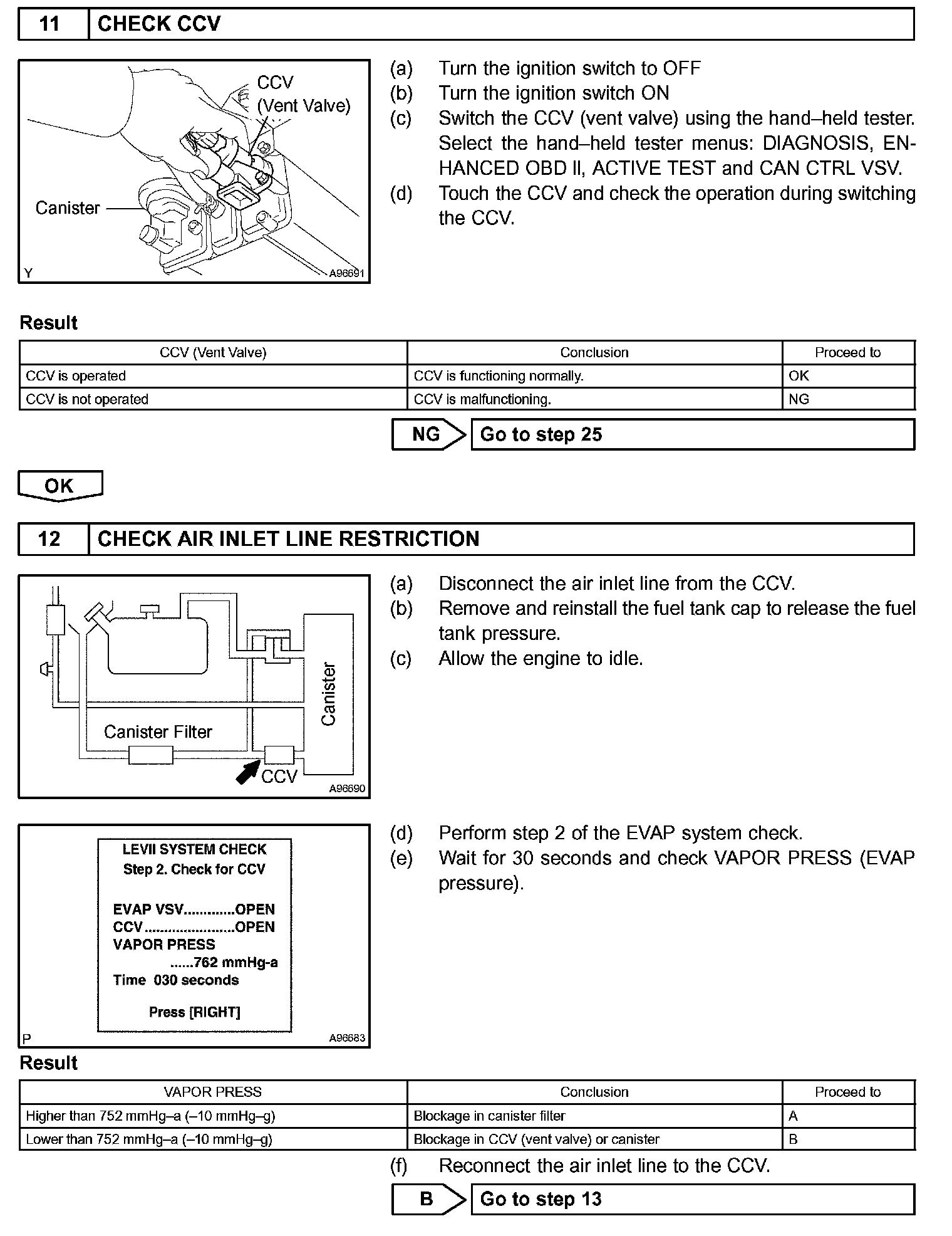 The EVAP monitor's purpose is to check for EVAP leaks and EVAP VSV and CCV malfunctions. The monitor performs the check by first introducing the intake manifold's negative pressure (vacuum) to the EVAP system. Then, the monitor records change in the EVAP system's pressure levels. The monitor runs when the following conditions are met: