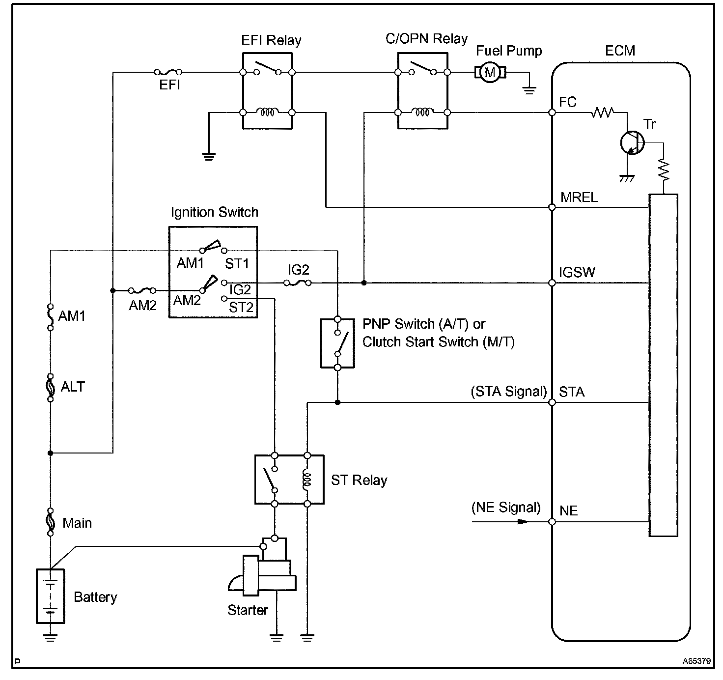 When the STA signal and NE signal are input to the ECM, Tr is turned ON, current flows to coil of the circuit opening relay (Marking: C/OPN), the relay switches on, power is supplied to the fuel pump and the fuel pump operates.