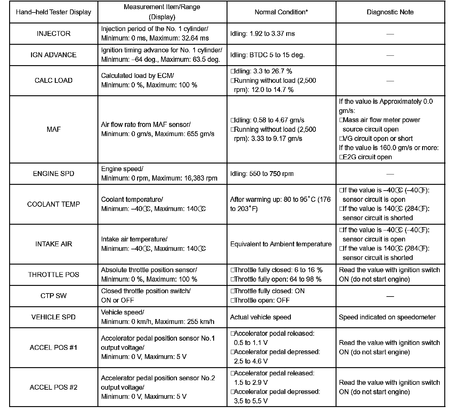 NOTE: In the table, the values listed under "Normal Condition" are reference values. Do not depend solely on the these reference values when deciding whether a part is faulty or not.