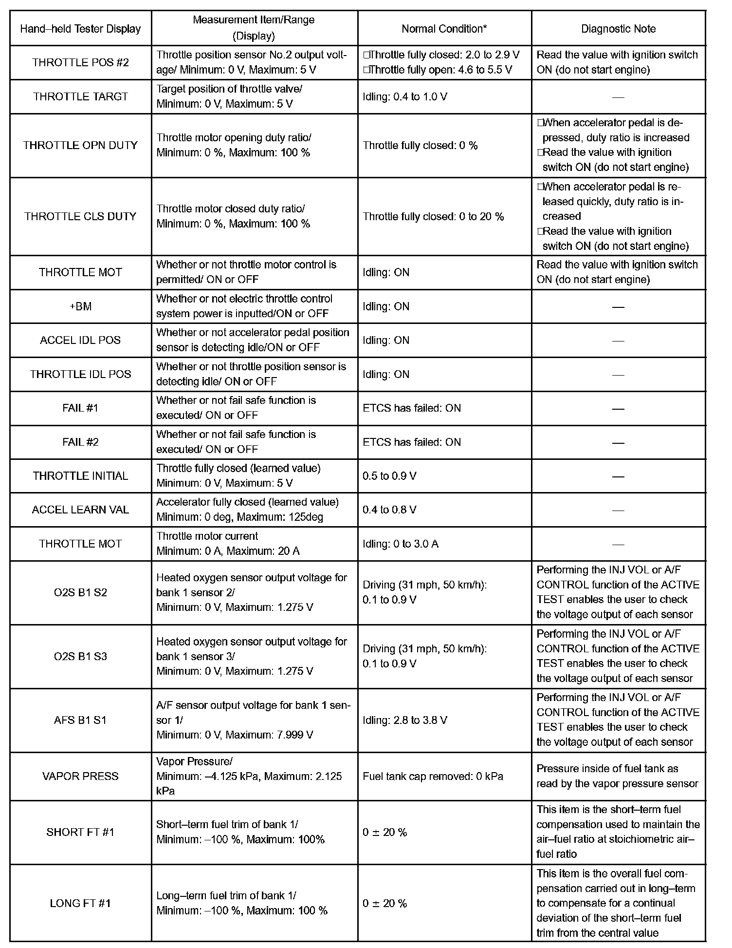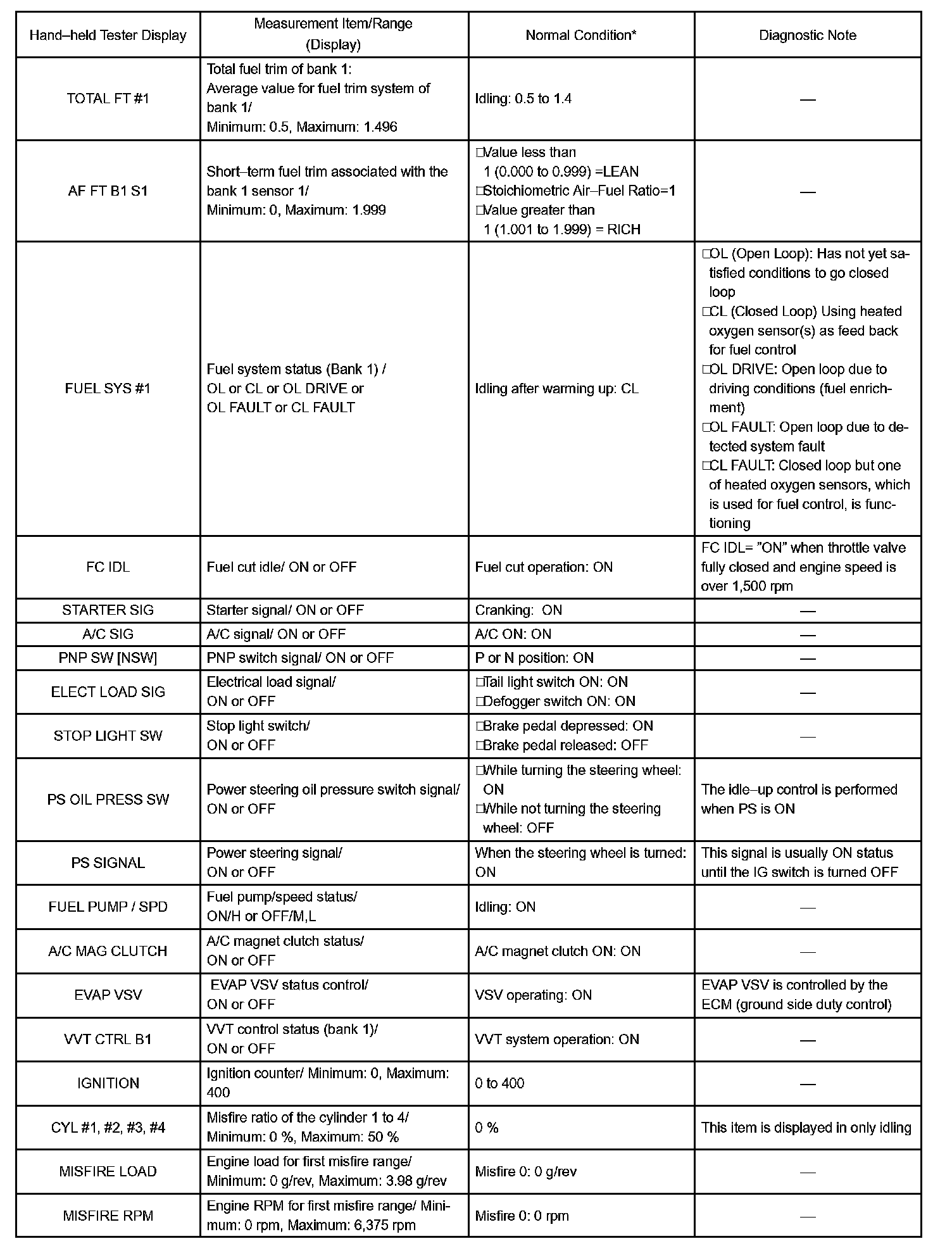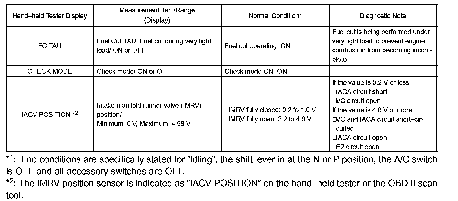 DATA LISTHINT: Using the hand-held tester DATA LIST allows switch, sensor, actuator and other item values to be read without removing any parts. Reading the DATA LIST early in troubleshooting is one way to shorten labor time.