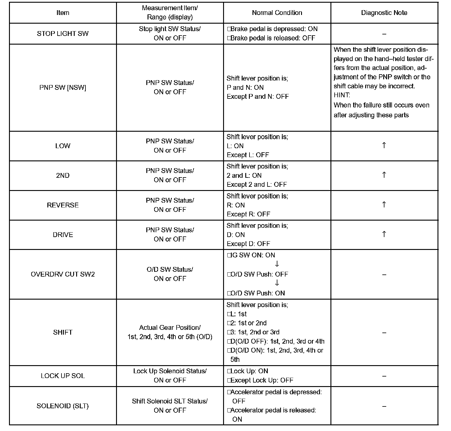 DATA LISTHINT: According to the DATA LIST displayed by the OBD II scan tool or hand-held tester, you can read the value of the switch, sensor, actuator and so on without parts removal. Reading the DATA LIST as the first step of troubleshooting is one method to shorten labor time.