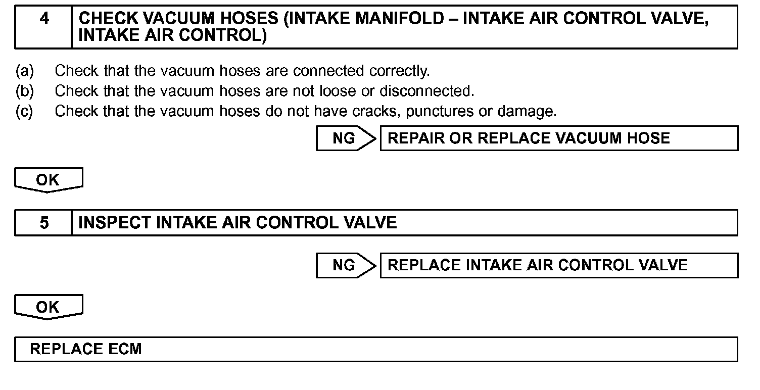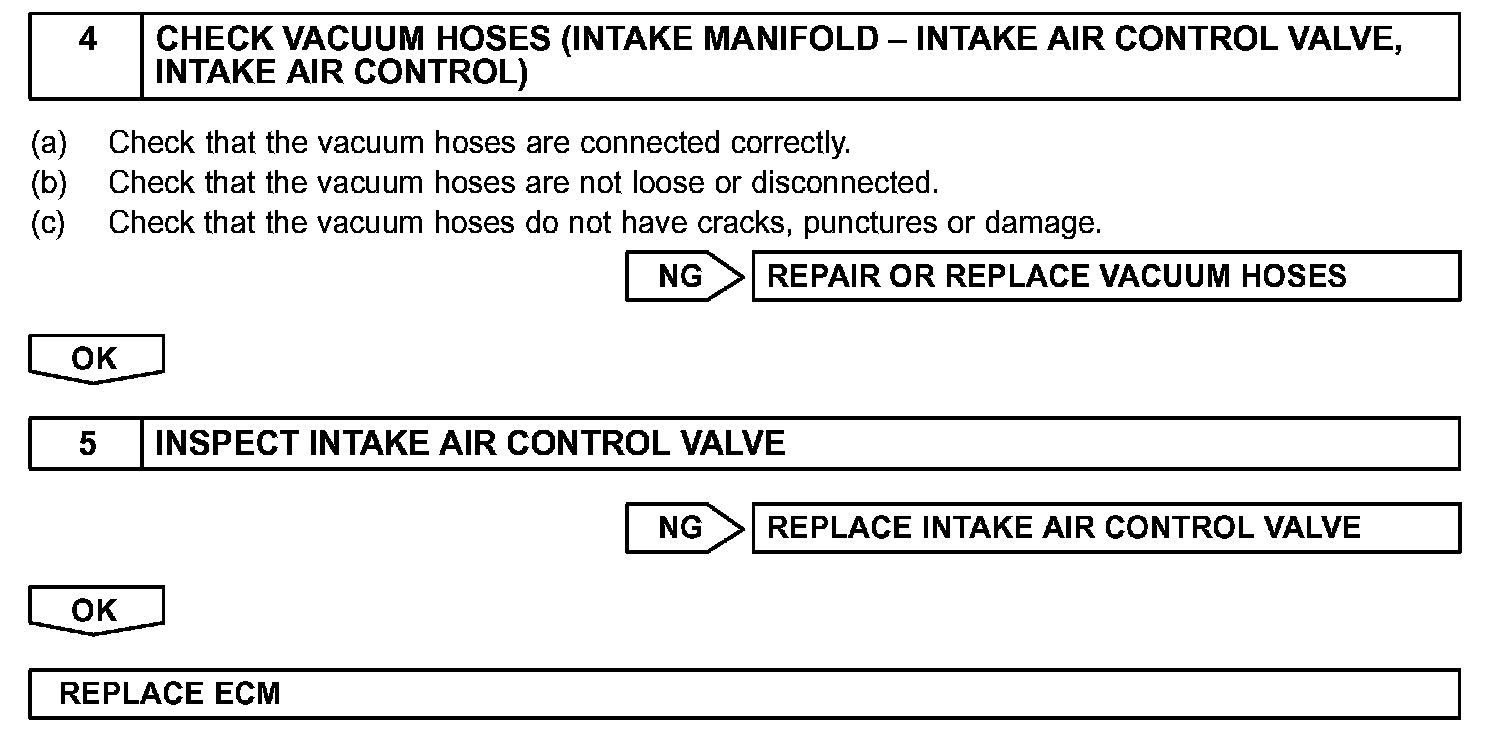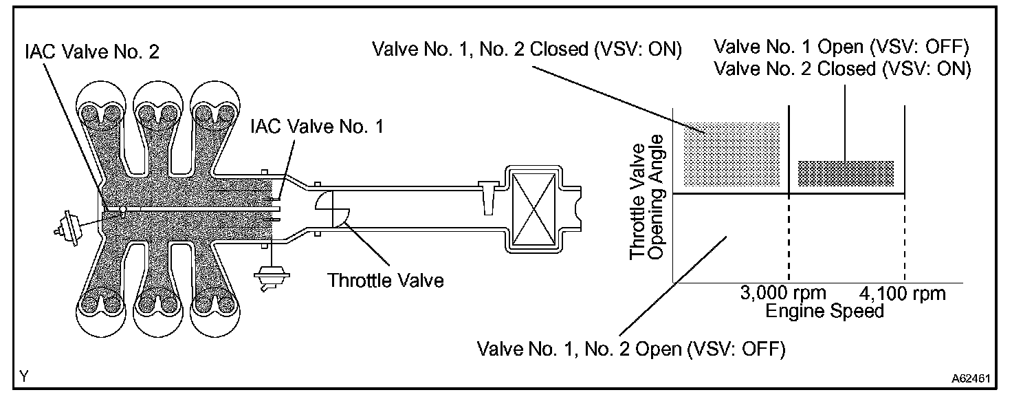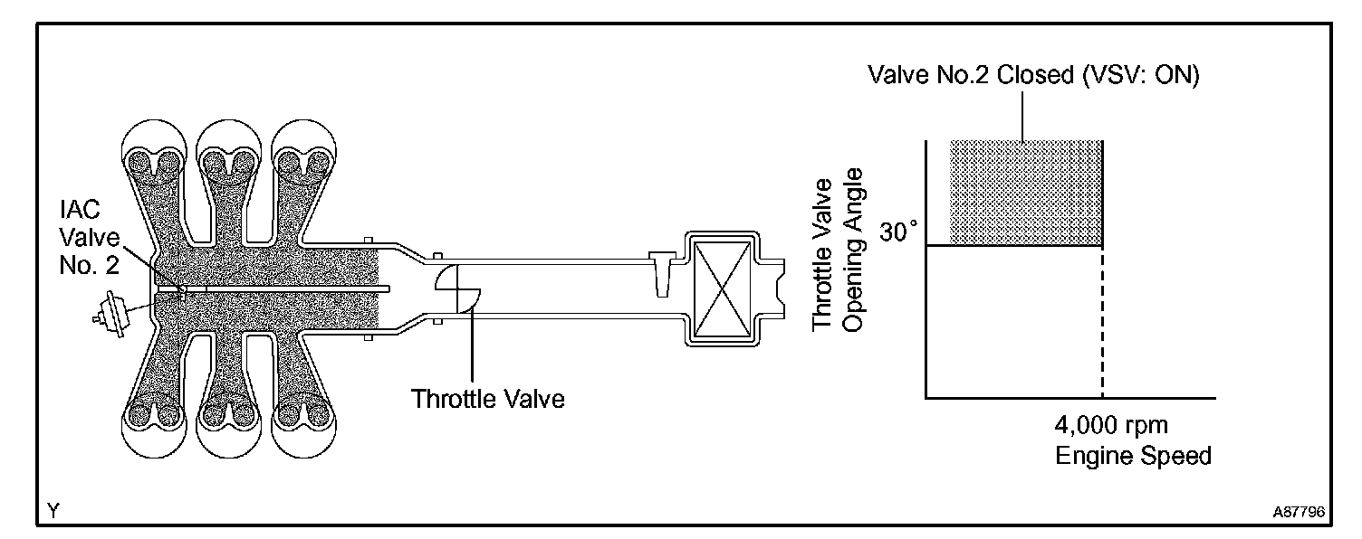 The ECM opens and closes the Intake Air Control (IAC) valve No. 2 in response to engine speed (RPM/NE). This system improves intake manifold tuning for better efficiency at low and high engine rpm. When the engine speed is 4,000 rpm or less and the throttle valve opening angle is 30° or more, the ECM turns the VSV On or Off to operate the IAC valve.