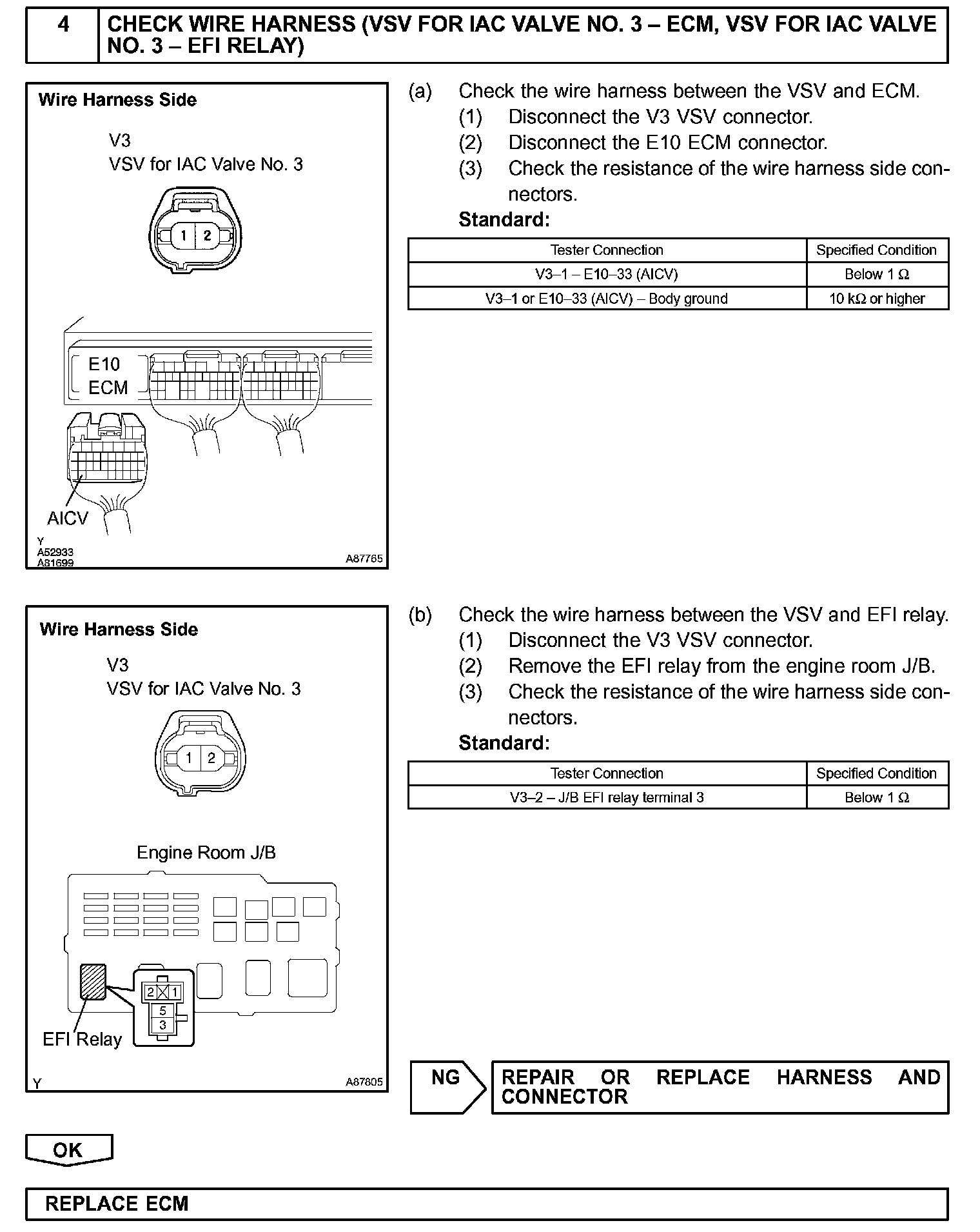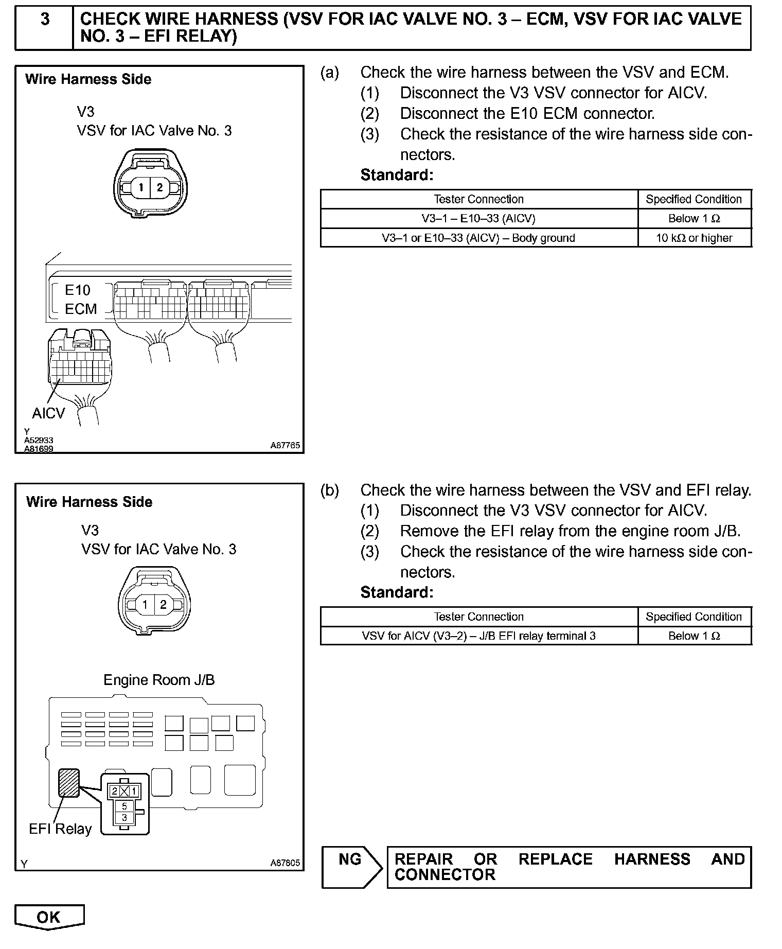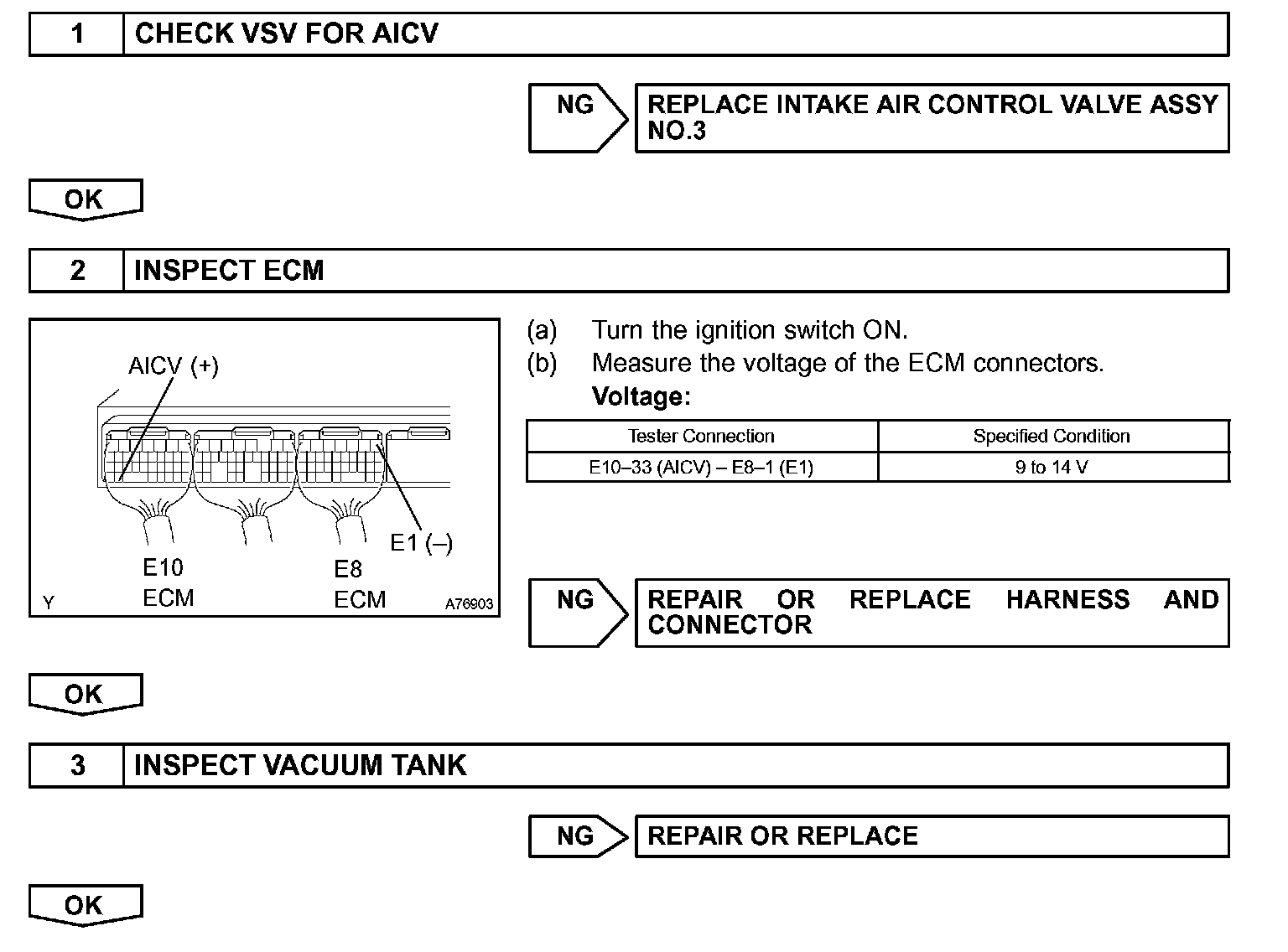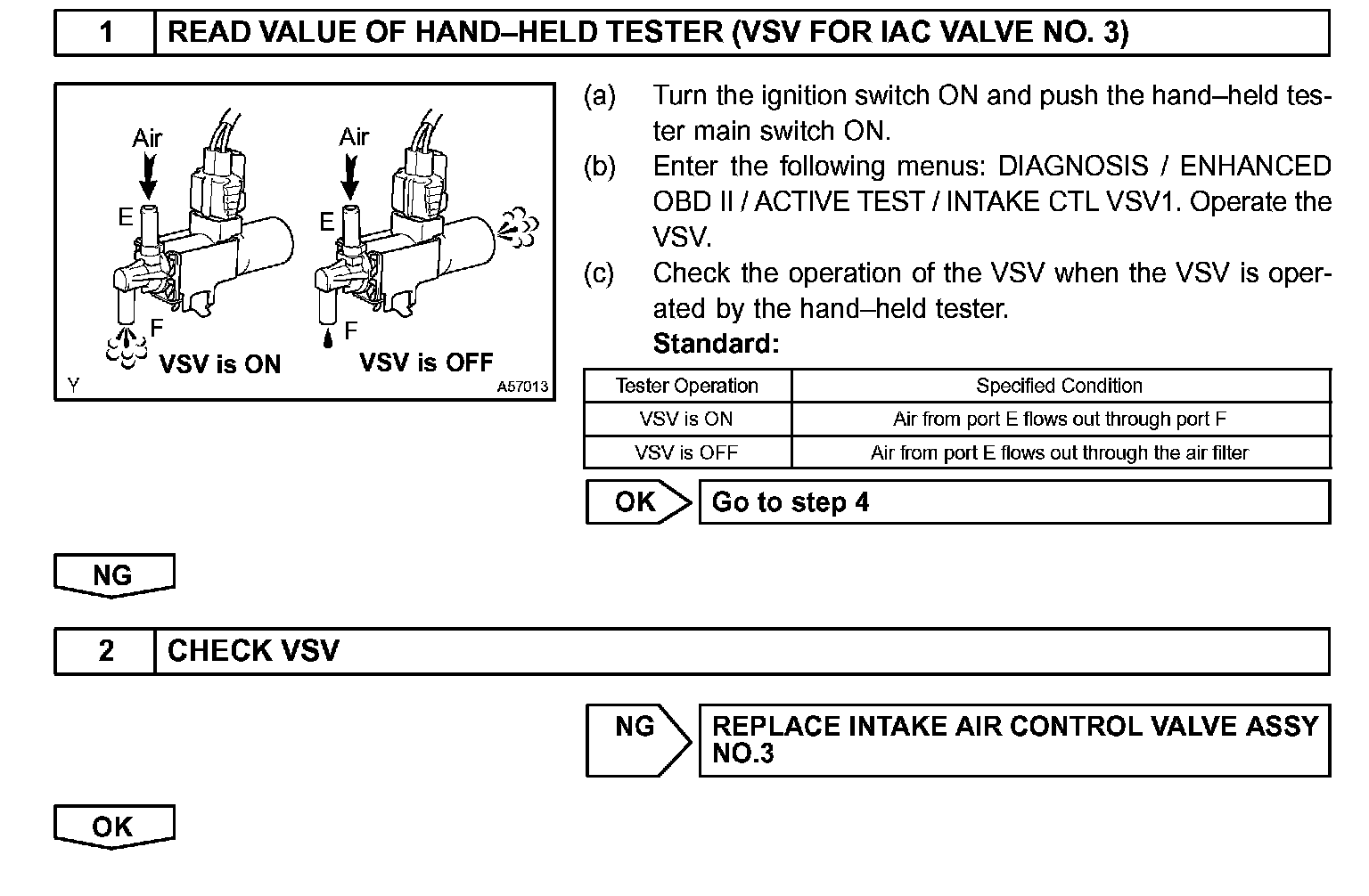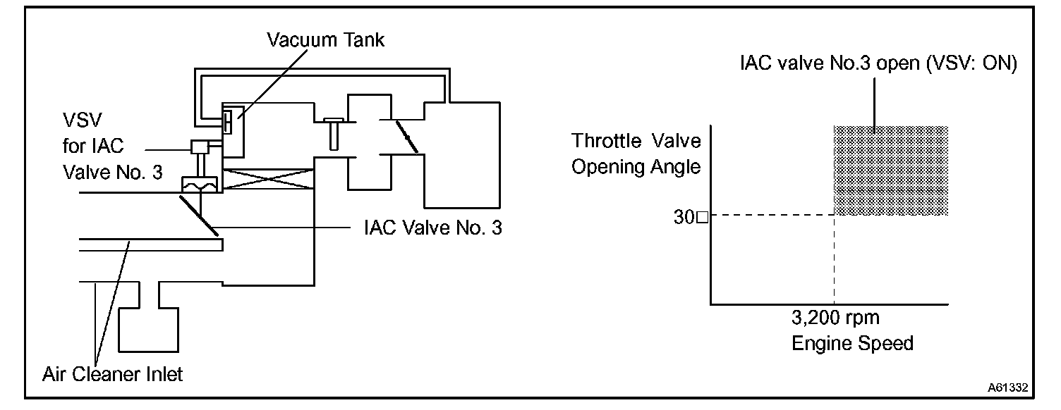 When the engine is operating at low to mid speeds, this system operates the IAC valve to close one of the air cleaner inlets. When the engine speed is more than 3,200 rpm and the opening angle of the throttle valve is more than 30°, the ECM activates the VSV and opens the IAC valve No. 3.