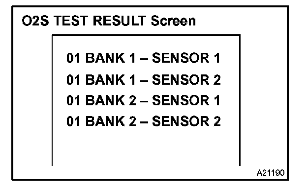 b. On the tester screen, select the following menus: DIAGNOSIS/CARB OBD II/O2S TEST RESULT. A list of the O2S equipped on the vehicle will be displayed.