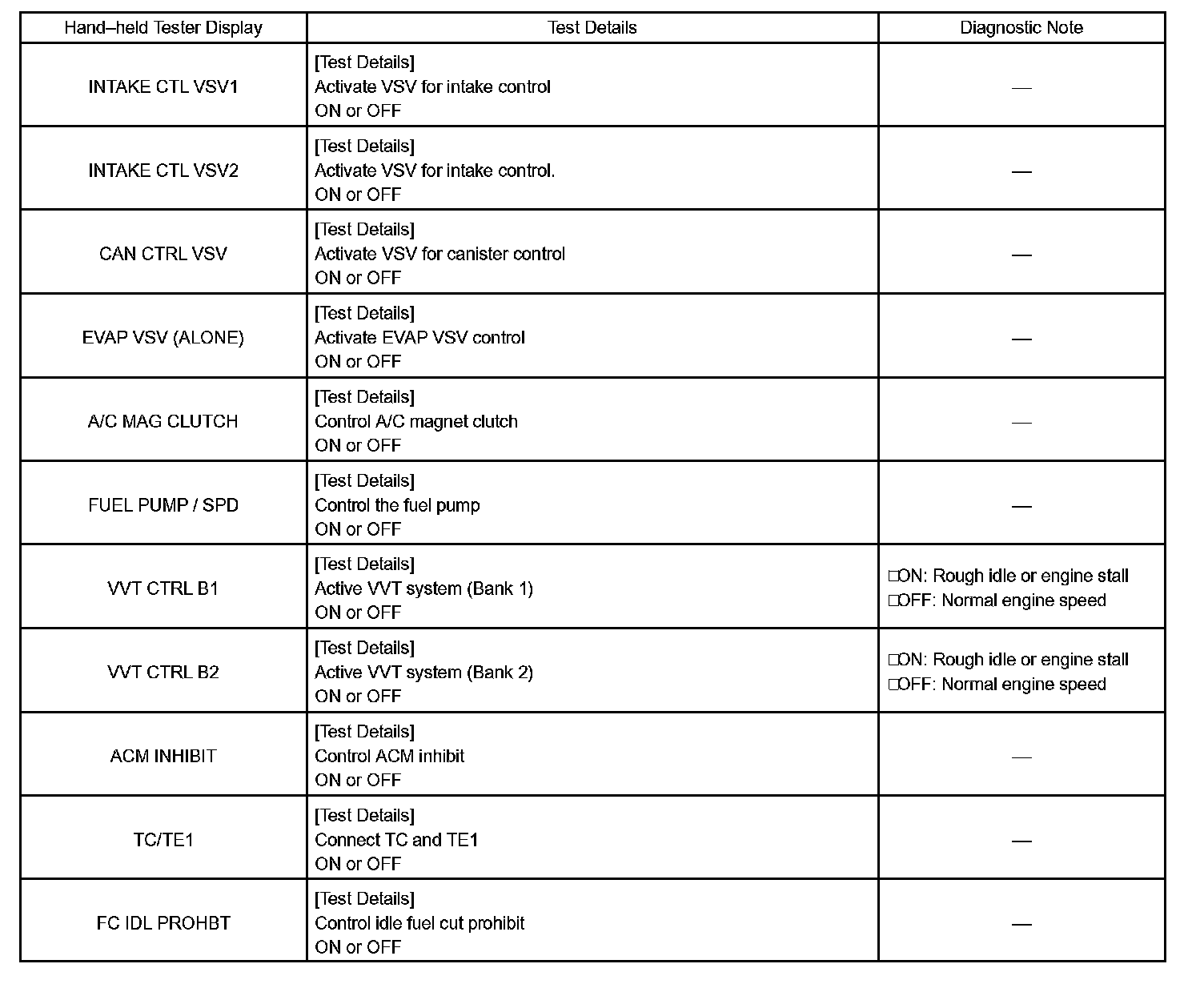 ACTIVE TESTHINT: Performing the hand-held tester ACTIVE TEST allows relay, VSV, actuator and other items to be operated without removing any parts. Performing the ACTIVE TEST early in troubleshooting is one way to shorten labor time. The DATA LIST can be displayed during the ACTIVE TEST.
