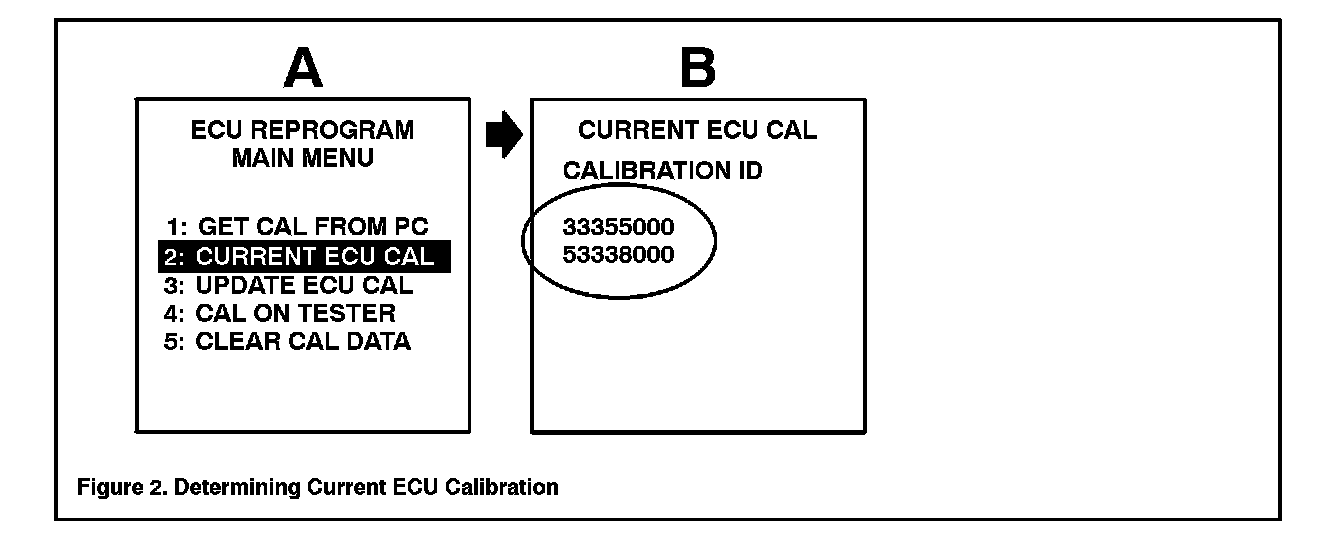 2. Connect the Diagnostic Tester to the vehicle and select CURRENT ECU CAL from the ECU REPROGRAM MAIN MENU. Determine the vehicle's current ECU calibration (see Figure 2).