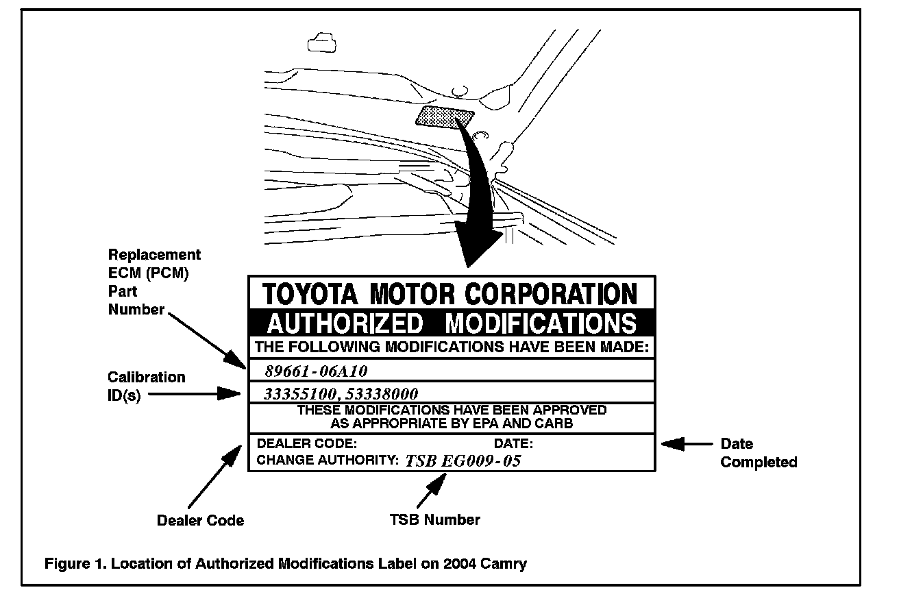 2. Check for the Authorized Modifications Label affixed to the vehicle in the location shown in Figure 1. Confirm if ECM (PCM) calibration has been updated. If not the latest ECM (PCM) calibration go to step 3.