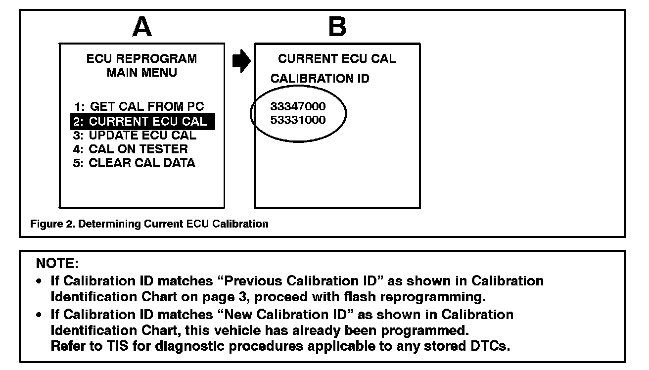 3. Connect the Diagnostic Tester to the vehicle and select CURRENT ECU CAL from the ECU REPROGRAM MAIN MENU. Determine the vehicle's current ECU calibration (see Figure 2).