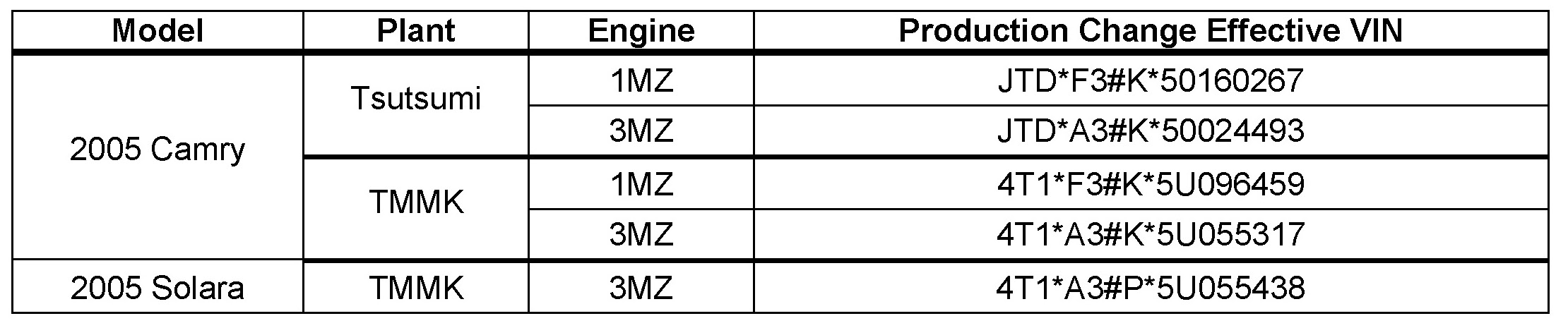 - 2005 model year Camry and Solara vehicles equipped with V6 engines, and produced BEFORE the Production Change Effective VINs shown below.