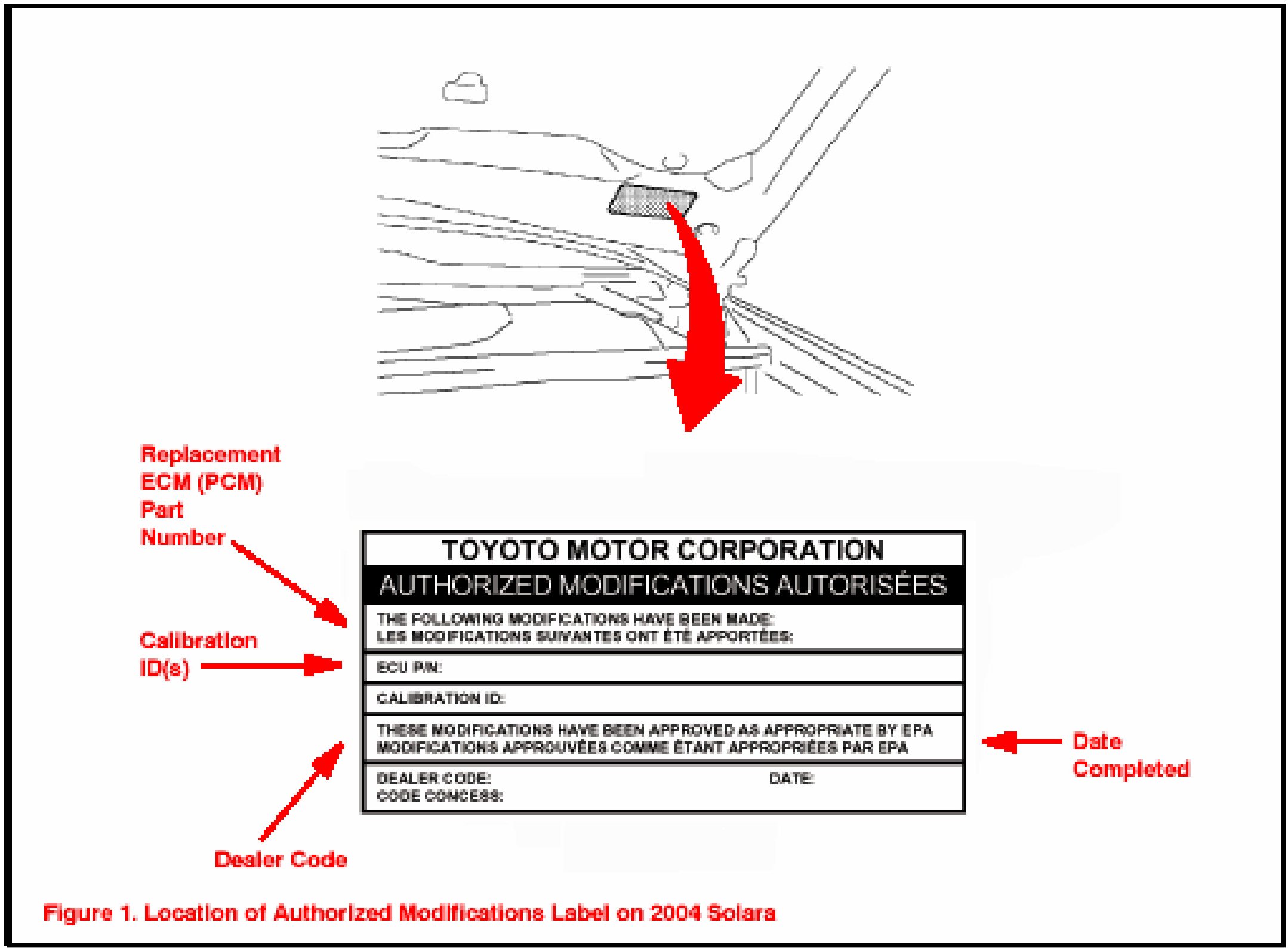 1. Check for the Authorized Modifications Label affixed to the vehicle in the location shown in Figure 1. Confirm if ECM (PCM) calibration has been updated. If not latest ECM (PCM) calibration - go to step 2.