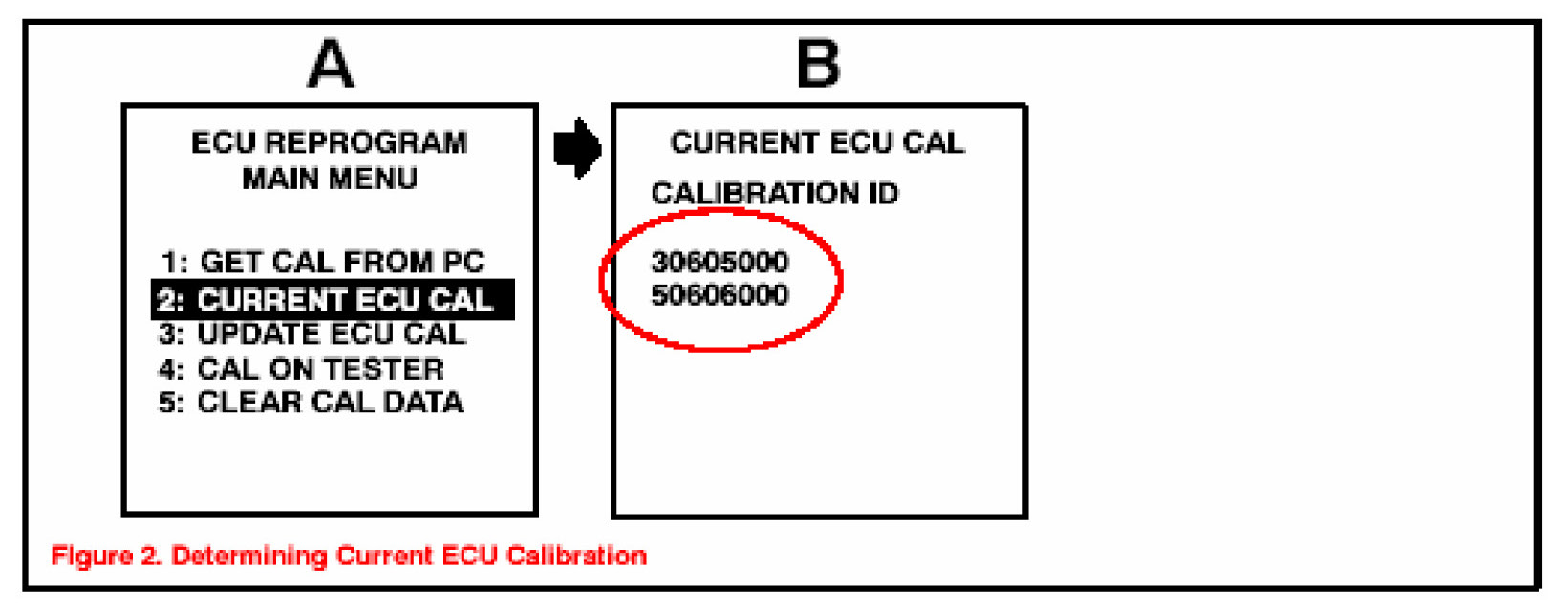 - If Calibration ID matches "Previous Calibration ID" as shown in Calibration Identification Chart, proceed with flash reprogramming.