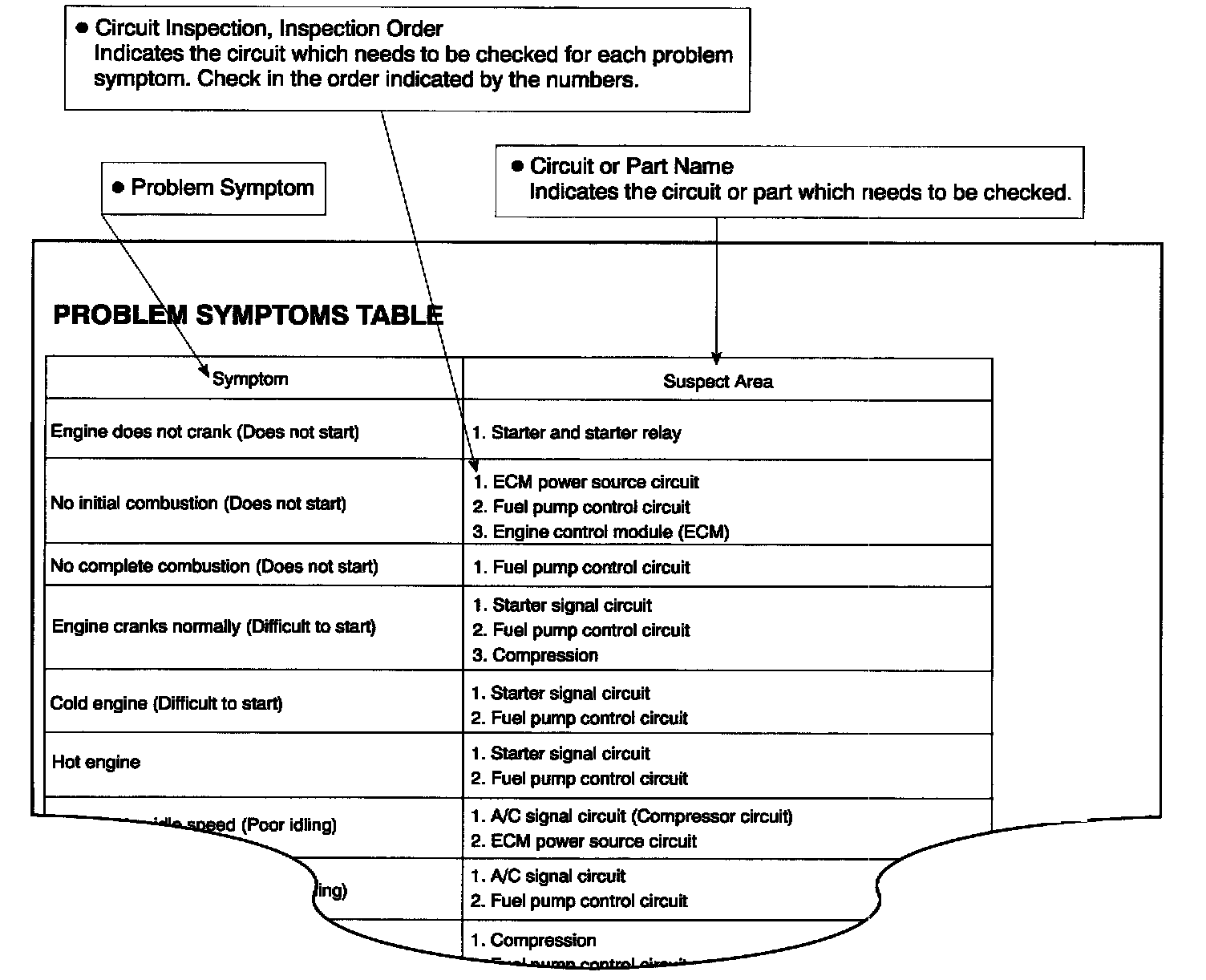 The suspected circuits or parts for each problem symptom are shown in the table. Use this table to troubleshoot the problem when a "Normal" code is displayed in the diagnostic trouble code chart but the problem is still occurring. Numbers in the table indicate the inspection order in which the circuits or parts should be checked.
