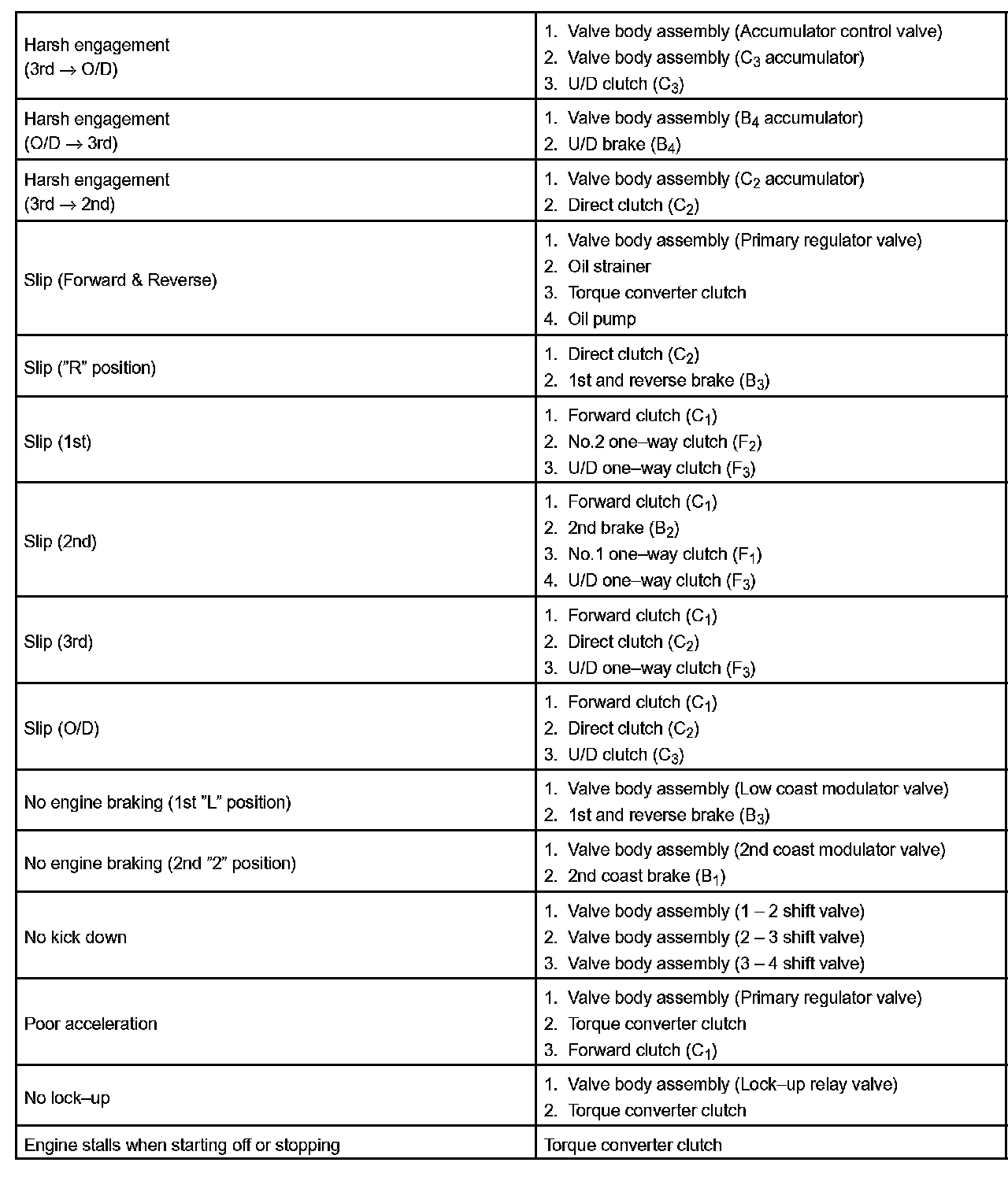 PROBLEM SYMPTOMS TABLEHINT: If a normal code is displayed during the diagnostic trouble code check although the trouble still occurs, check the electrical circuits for each symptom in the order given in the charts and proceed to the troubleshooting.