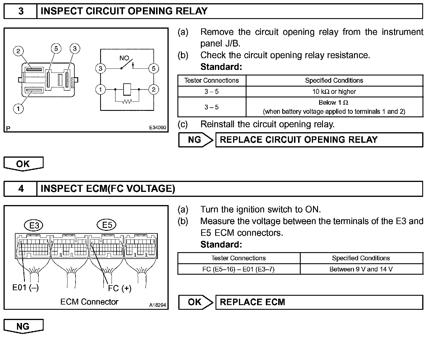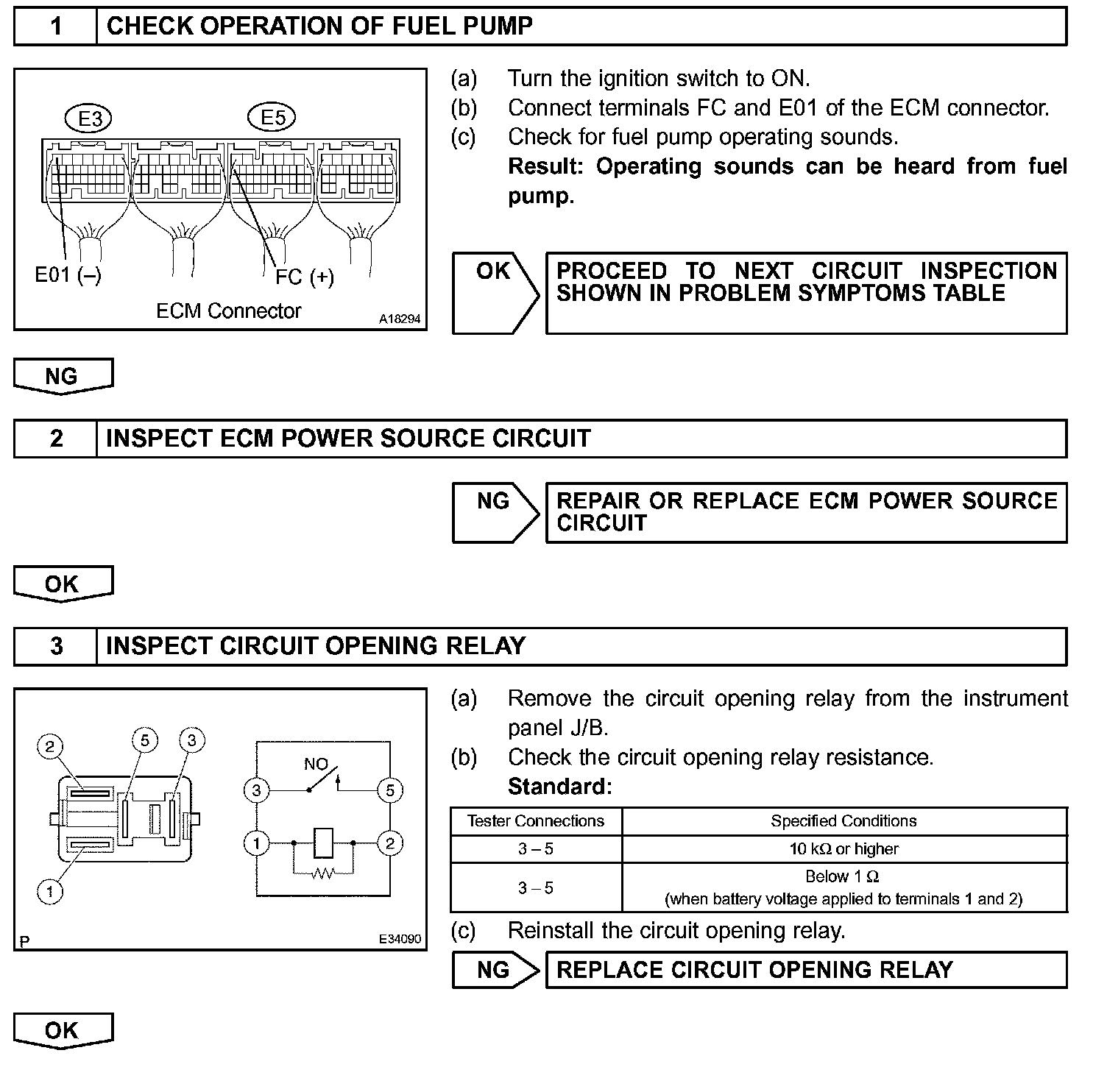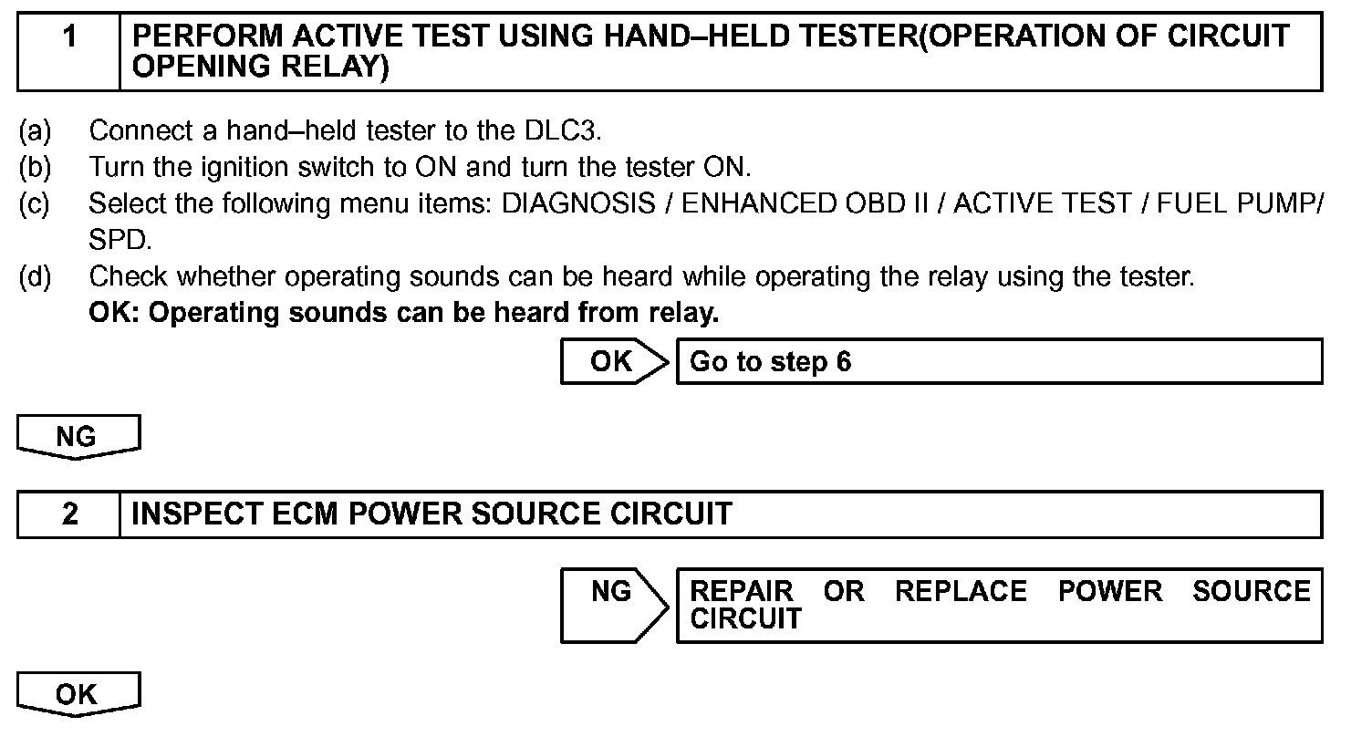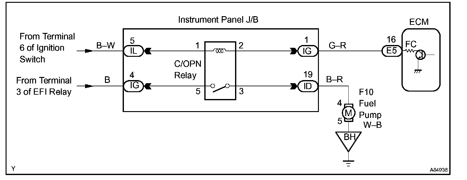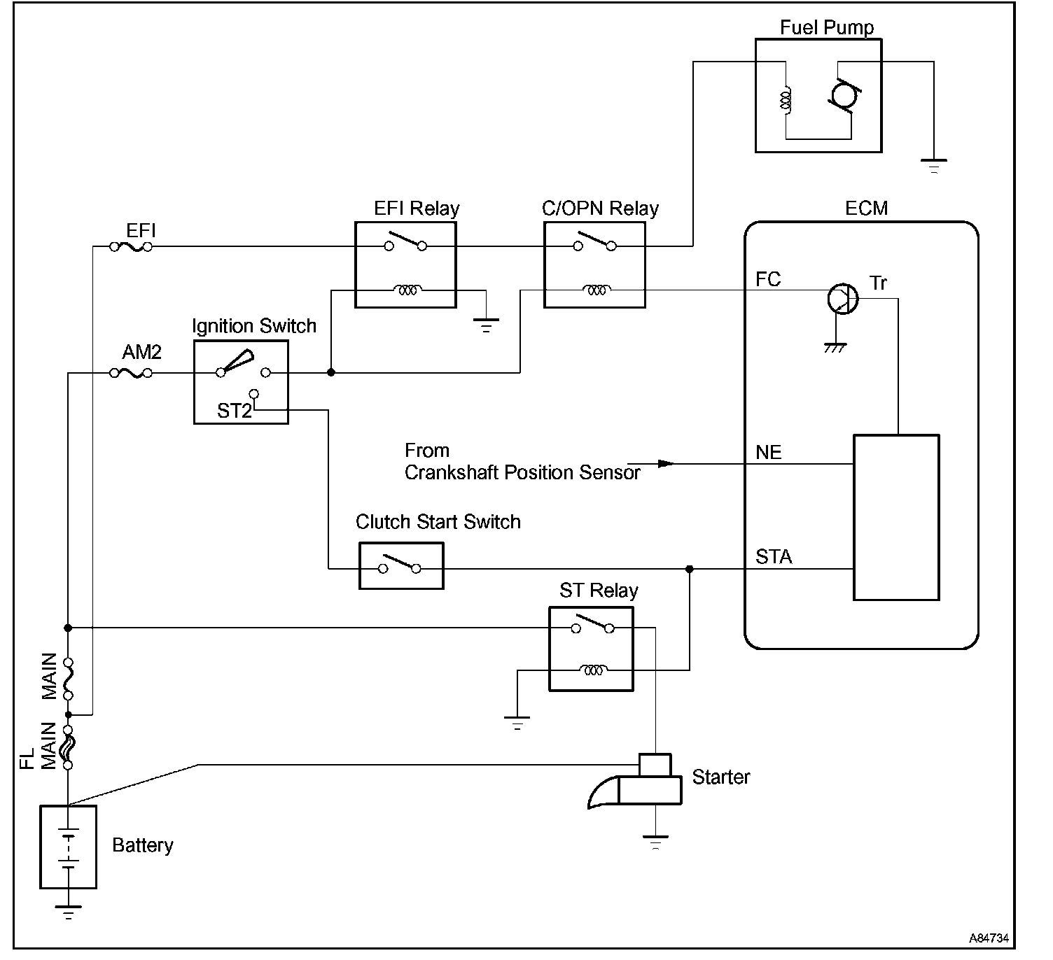 When the STA and NE signals are received by the ECM, Tr (power transistor) is switched on, allowing a current to flow into the circuit opening relay coil. The circuit opening relay switches on, power is supplied to the fuel pump and the fuel pump operates.