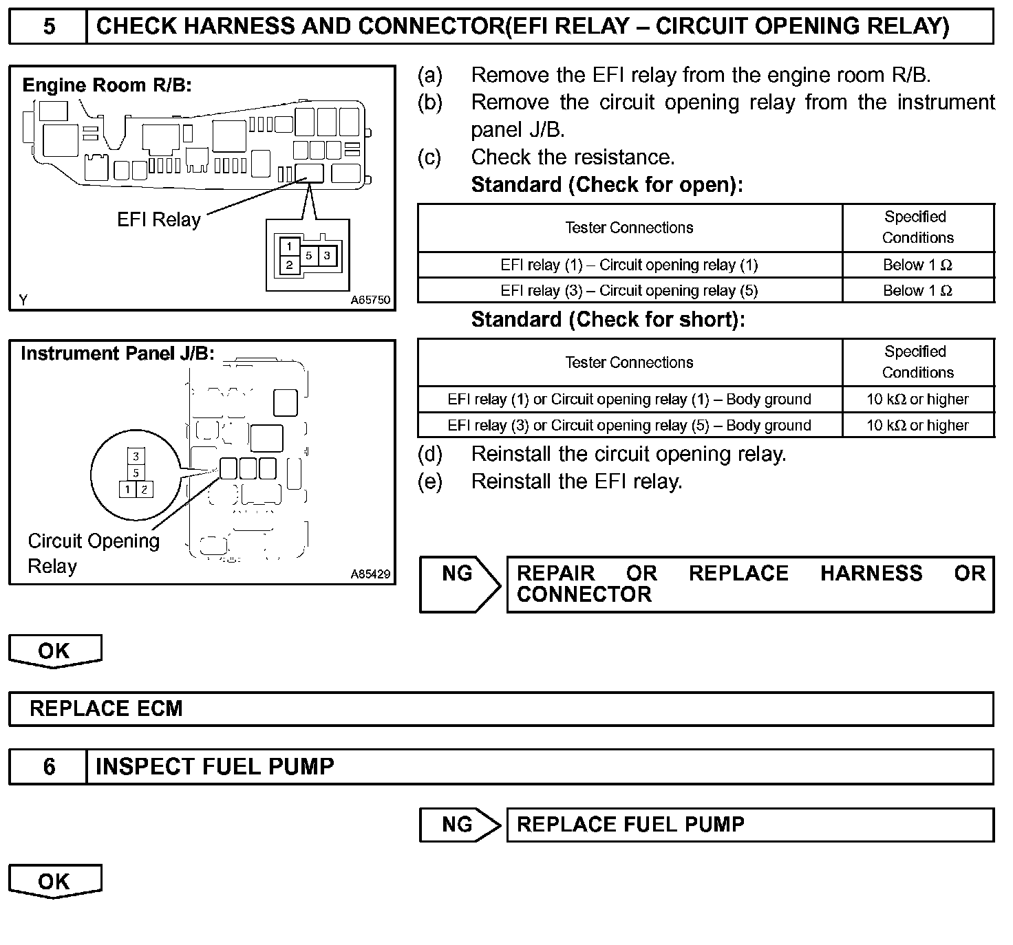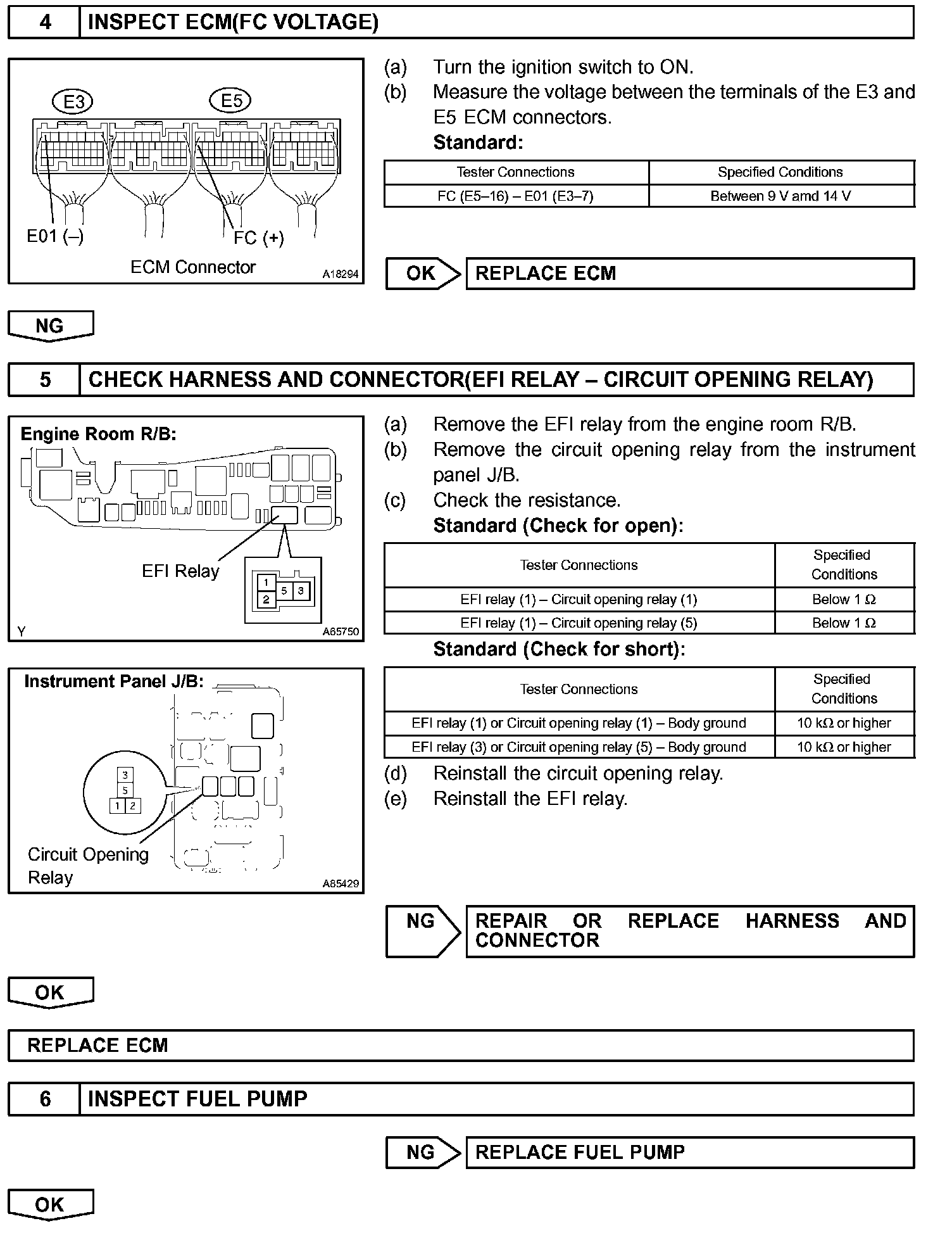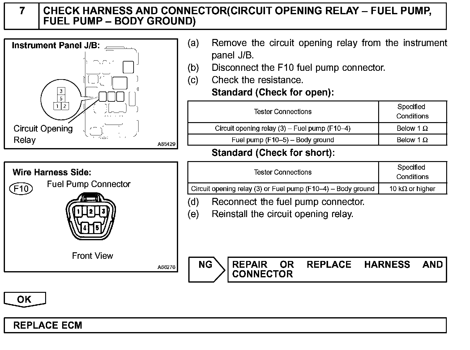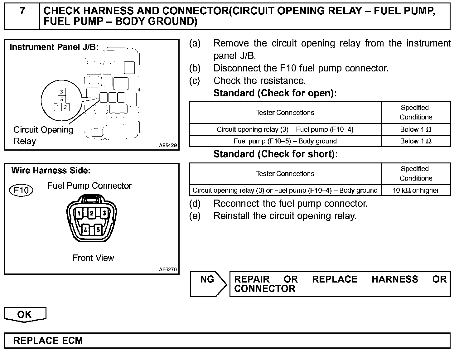 When the STA and NE signals are received by the ECM, Tr (power transistor) is switched on, allowing a current to flow into the circuit opening relay coil. The circuit opening relay switches on, power is supplied to the fuel pump and the fuel pump operates.