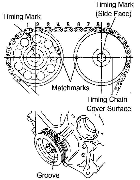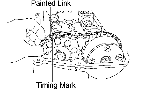 h. Check that the 2 matchmarks are aligned on the timing chain cover surface. Also, check that each timing mark is aligned with its corresponding painted link on the timing chain as shown in the illustration.