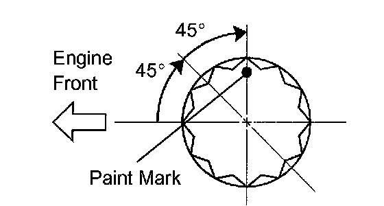 h. Check that the 2 matchmarks are aligned on the timing chain cover surface. Also, check that each timing mark is aligned with its corresponding painted link on the timing chain as shown in the illustration.