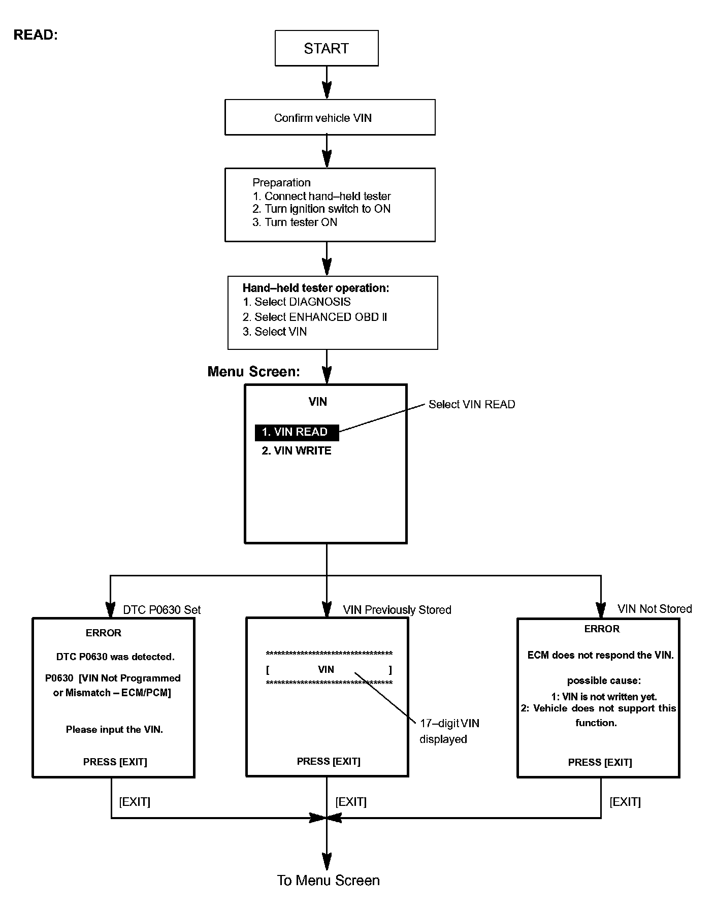 2. Read VIN: Explains the VIN reading process with the flowchart. This process allows the VIN stored in the ECM to be read, in order to confirm that the two VINs, provided to the vehicle and stored in the vehicle's ECM, are the same.