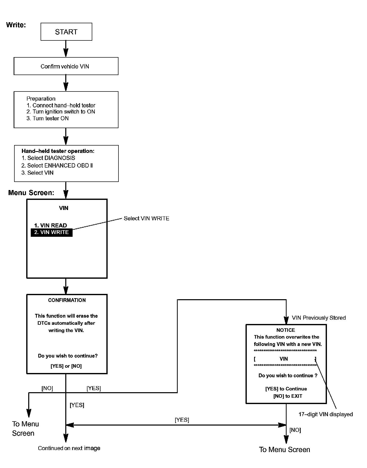 3. Write VIN: Explains the VIN writing process with the flowchart. This process allows the VIN to be input into the ECM. If the ECM is changed, or the VIN and VIN do not match, the VIN can be registered, or overwritten in the ECM by following this procedure.