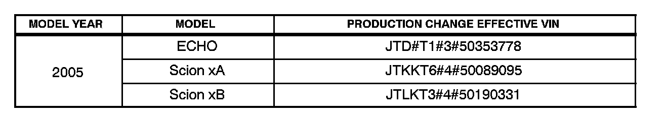 ^ 2004 - 2005 model year ECHO vehicles produced BEFORE the Production Change Effective VINs shown below.