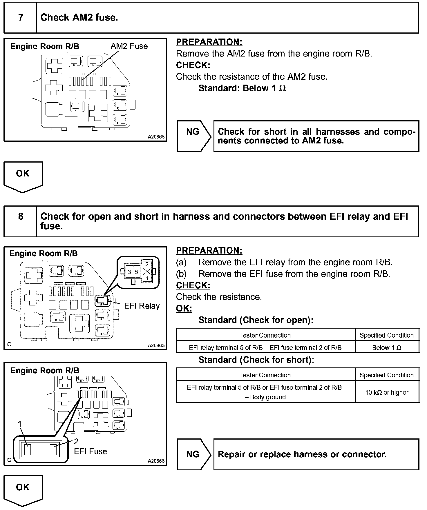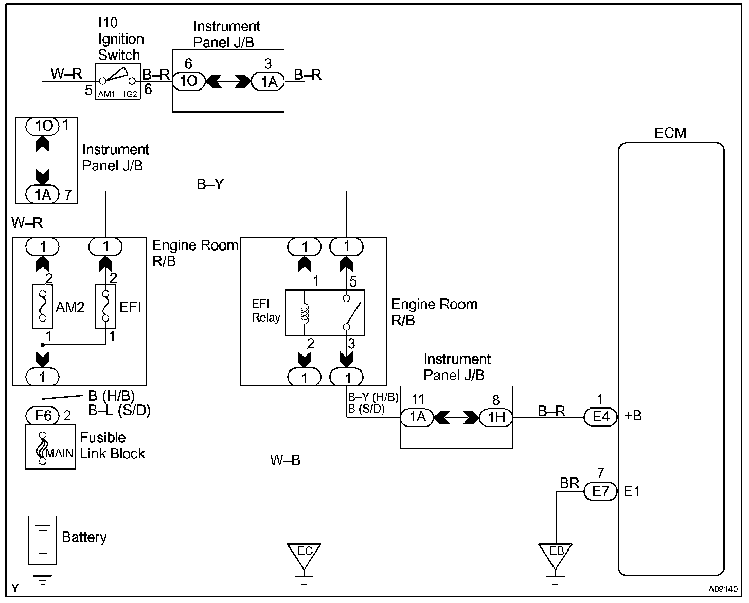 When the ignition switch is turned to ON, battery voltage is applied to the coil which closes the contacts of the EFI main relay (Marked: EFI) and supplies power to terminal +B of the ECM.