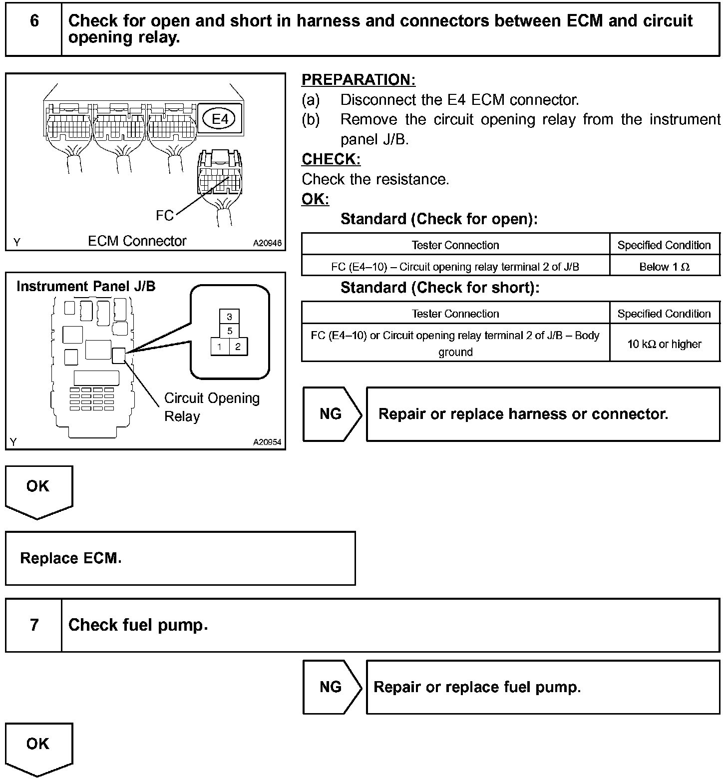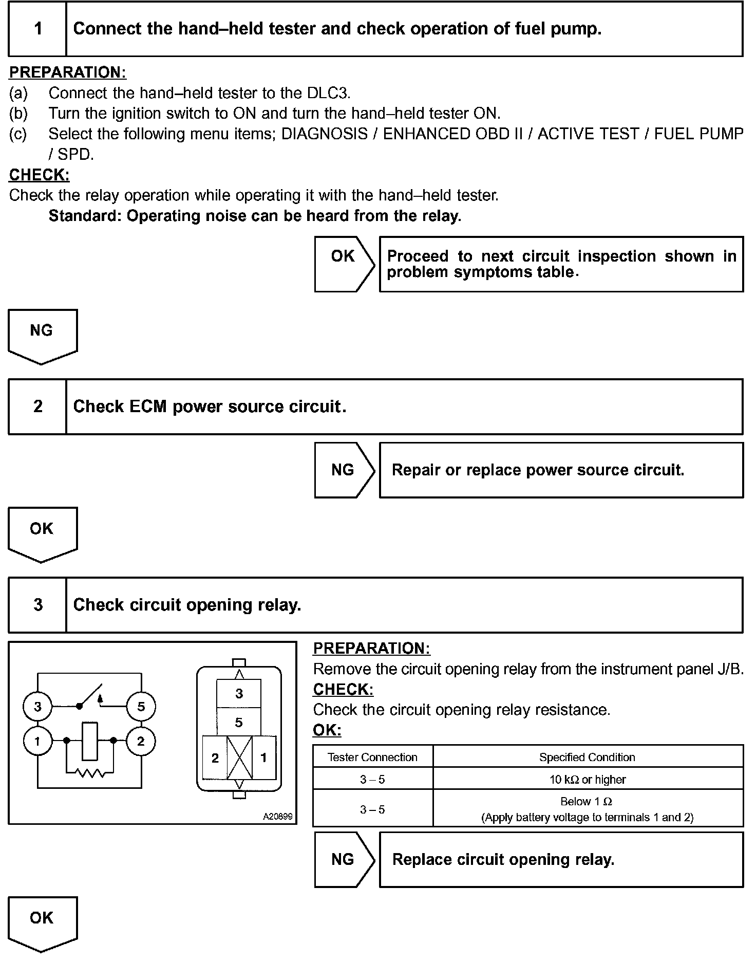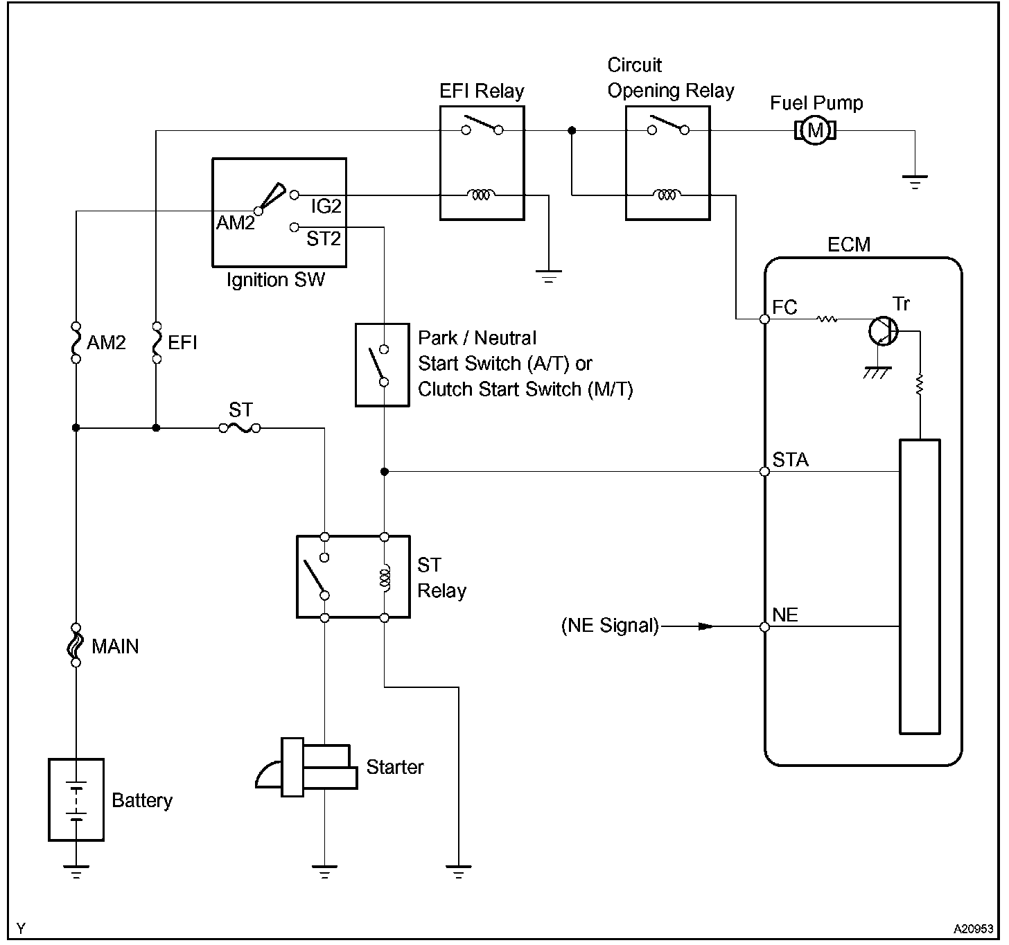 When the STA signal and NE signal are input to the ECM, Tr is turned ON, current flows to the coil of the circuit opening relay, the relay switches on, power is supplied to the fuel pump and the fuel pump operates. While the NE signal is generated (engine running), the ECM keeps Tr ON (circuit opening relay ON) and the fuel pump also keeps operating.