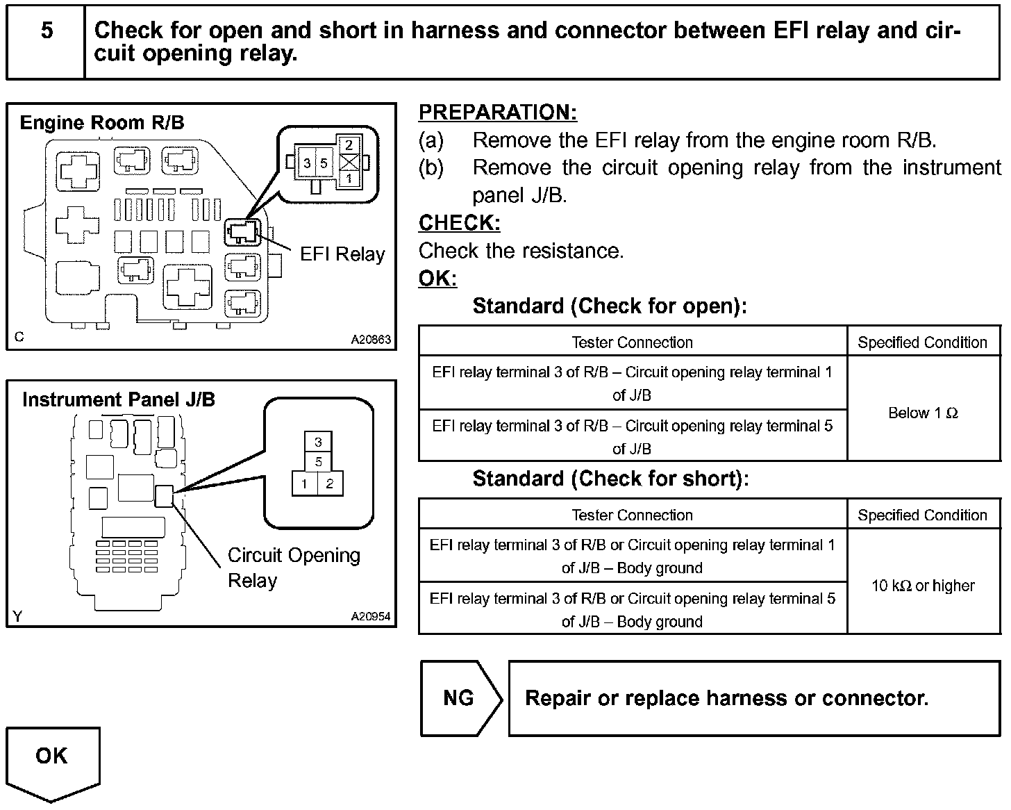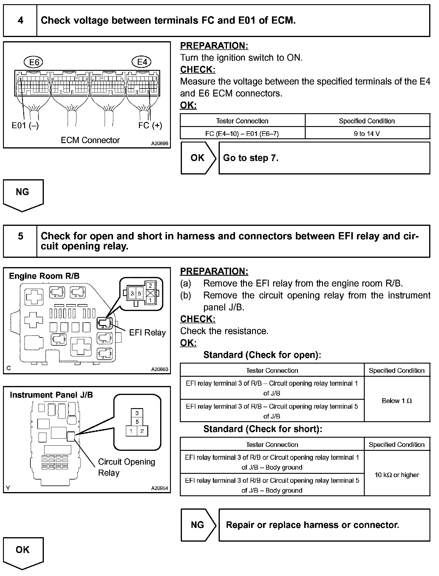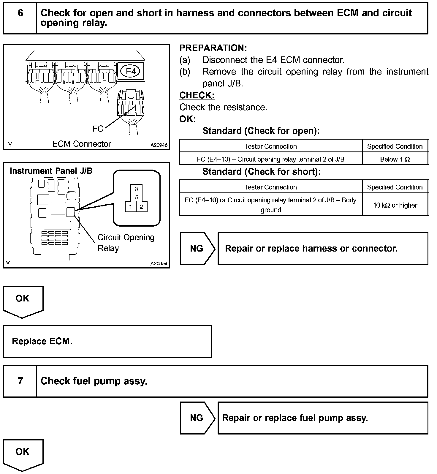 When the STA signal and NE signal are input to the ECM, Tr is turned ON, current flows to the coil of the circuit opening relay, the relay switches on, power is supplied to the fuel pump and the fuel pump operates. While the NE signal is generated (engine running), the ECM keeps Tr ON (circuit opening relay ON) and the fuel pump also keeps operating.