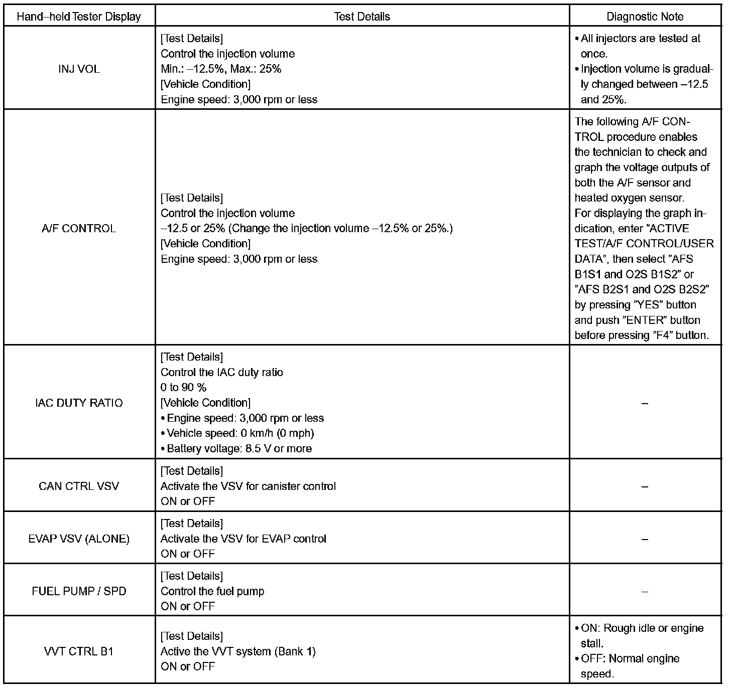 ACTIVE TESTHINT: Performing an ACTIVE TEST enables components including the relays, VSV (Vacuum Switching Valve), and actuators, to be operated without removing any parts. The ACTIVE TEST can be performed with a hand-held tester. Performing an ACTIVE TEST as a first step of troubleshooting is one method of shortening diagnostic time.