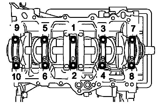 Install and uniformly tighten the 10 bolts of the bearing cap is several passes, in the sequence shown.