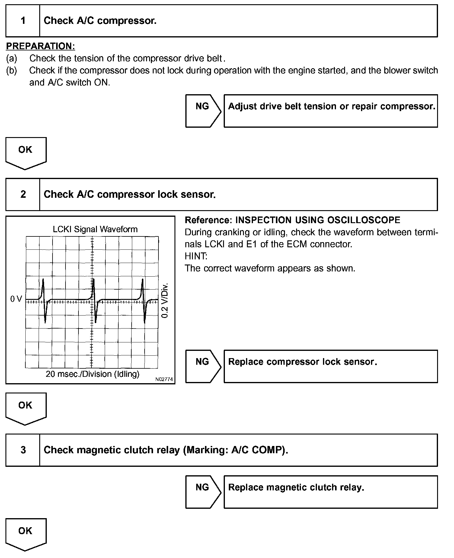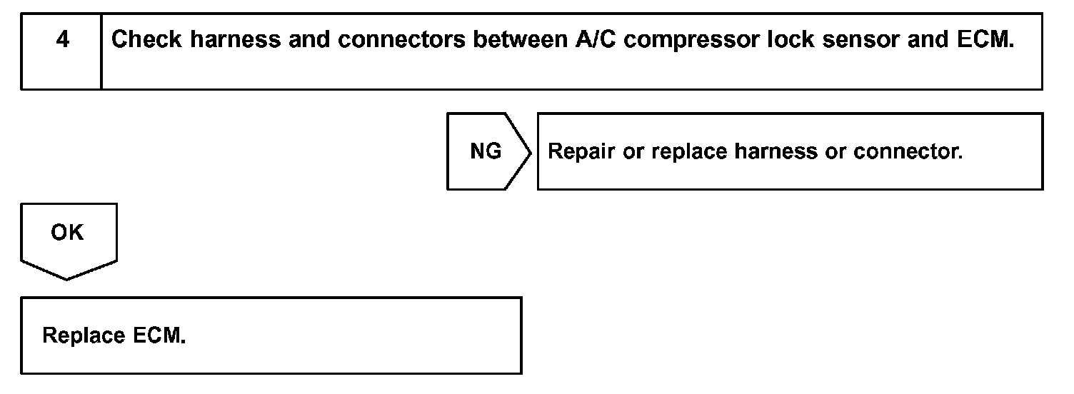 This sensor sends 1 pulse per engine revolution to the ECM. If the number ratio of the compressor speed divided by the engine speed is smaller than a predetermined value, the ECM turns the compressor off. And, the indicator flashes at about 1 second interval.