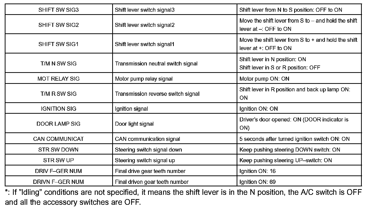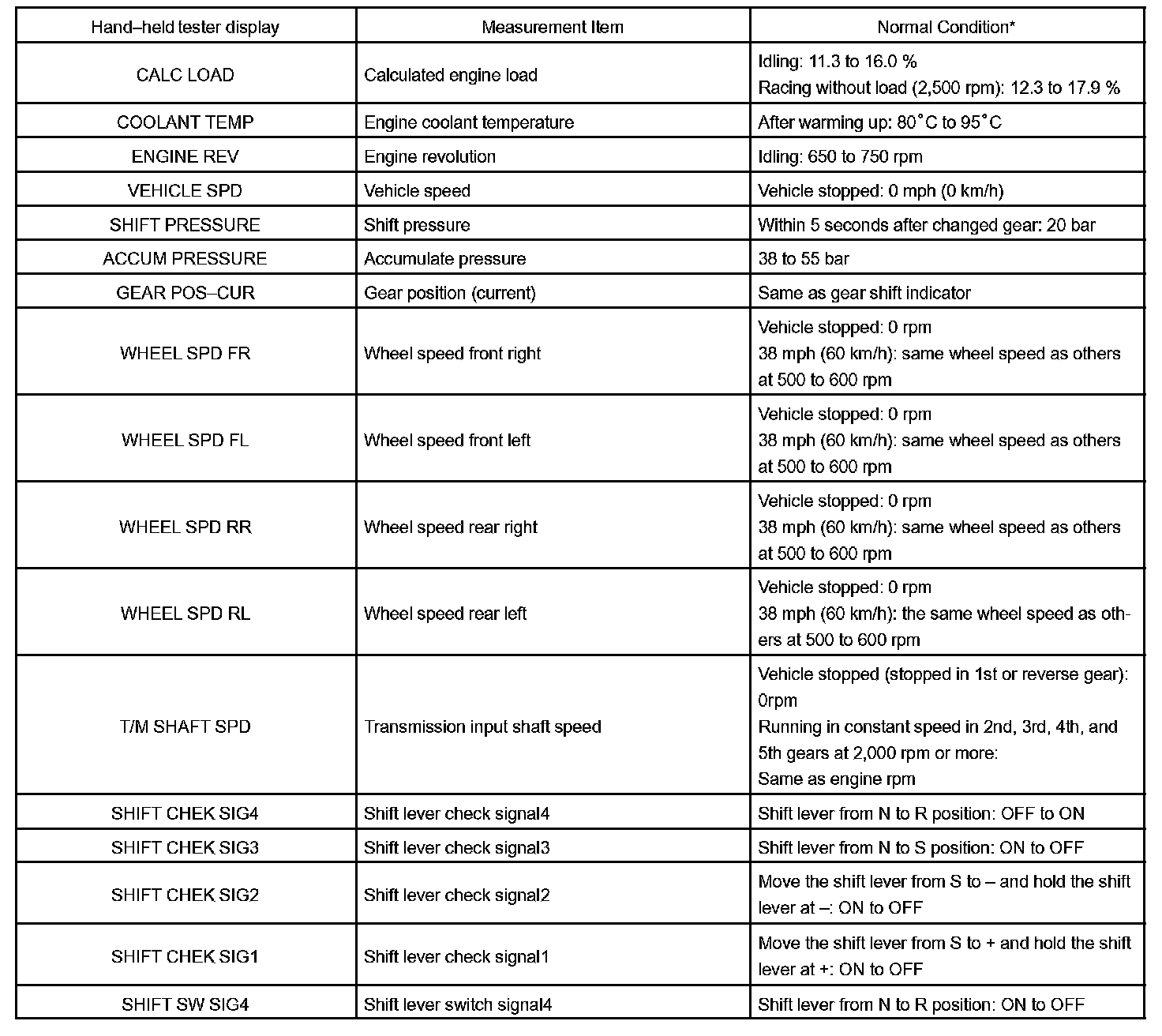 SEQUENTIAL MANUAL TRANSMISSION OPERATING CONDITIONNOTE: The values given for "Normal Condition" are reference values only. A vehicle may still be normal even if its value differs from those listed. Do not depend solely on the "Normal Condition" column when deciding whether a part is faulty or not.