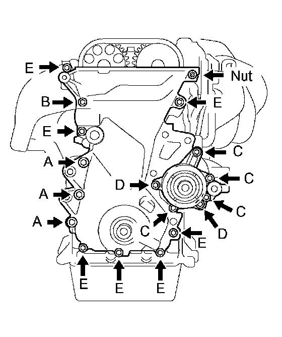 Install the timing chain cover, a new O-ring and the water pump with the 17 bolts and nut. Uniformly tighten the bolts and nut in several passes.