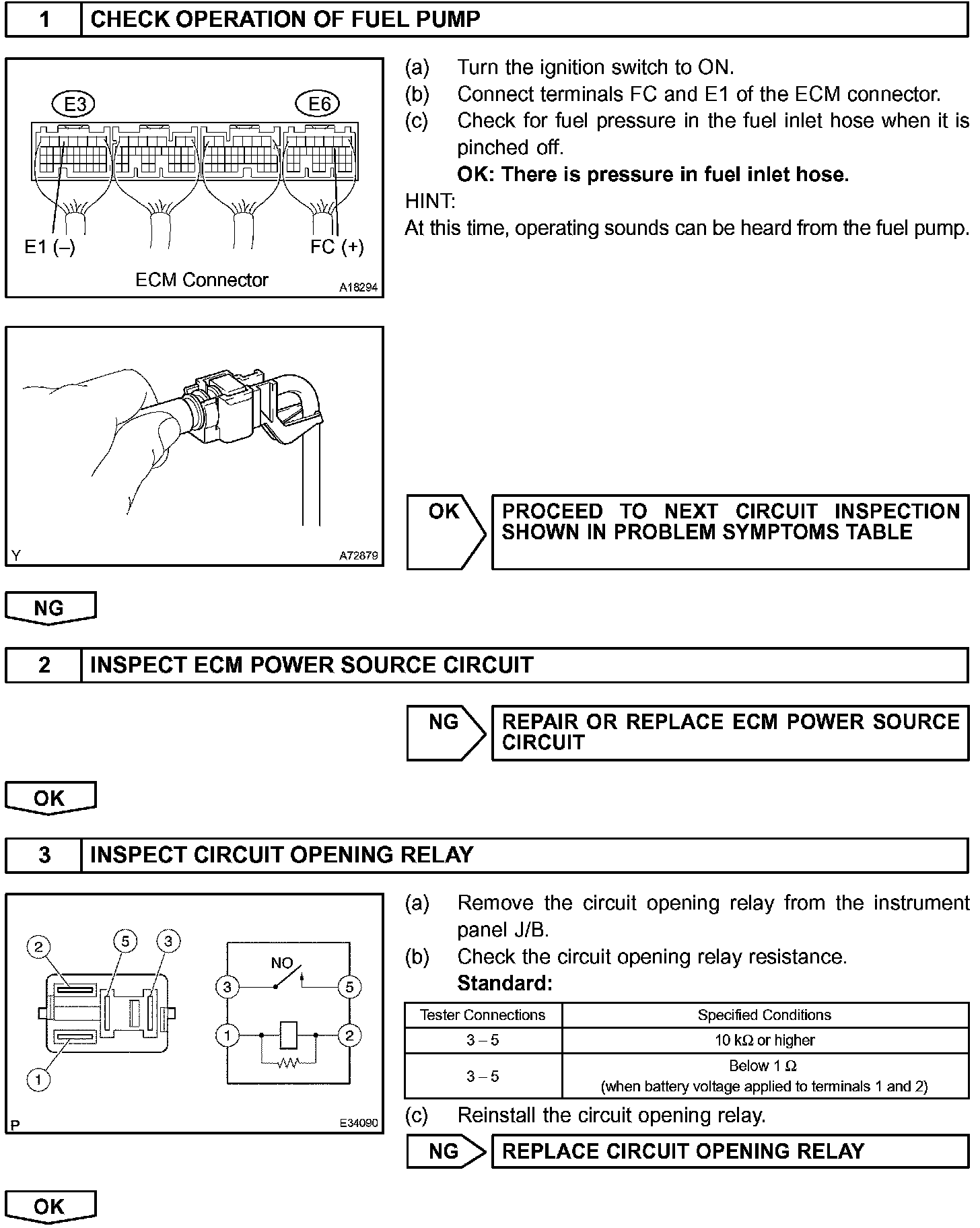 When the STA and NE signals are received by the ECM, Tr (power transistor) is switched on, allowing a current to flow into the circuit opening relay coil. The circuit opening relay switches on, power is supplied to the fuel pump and the fuel pump operates.