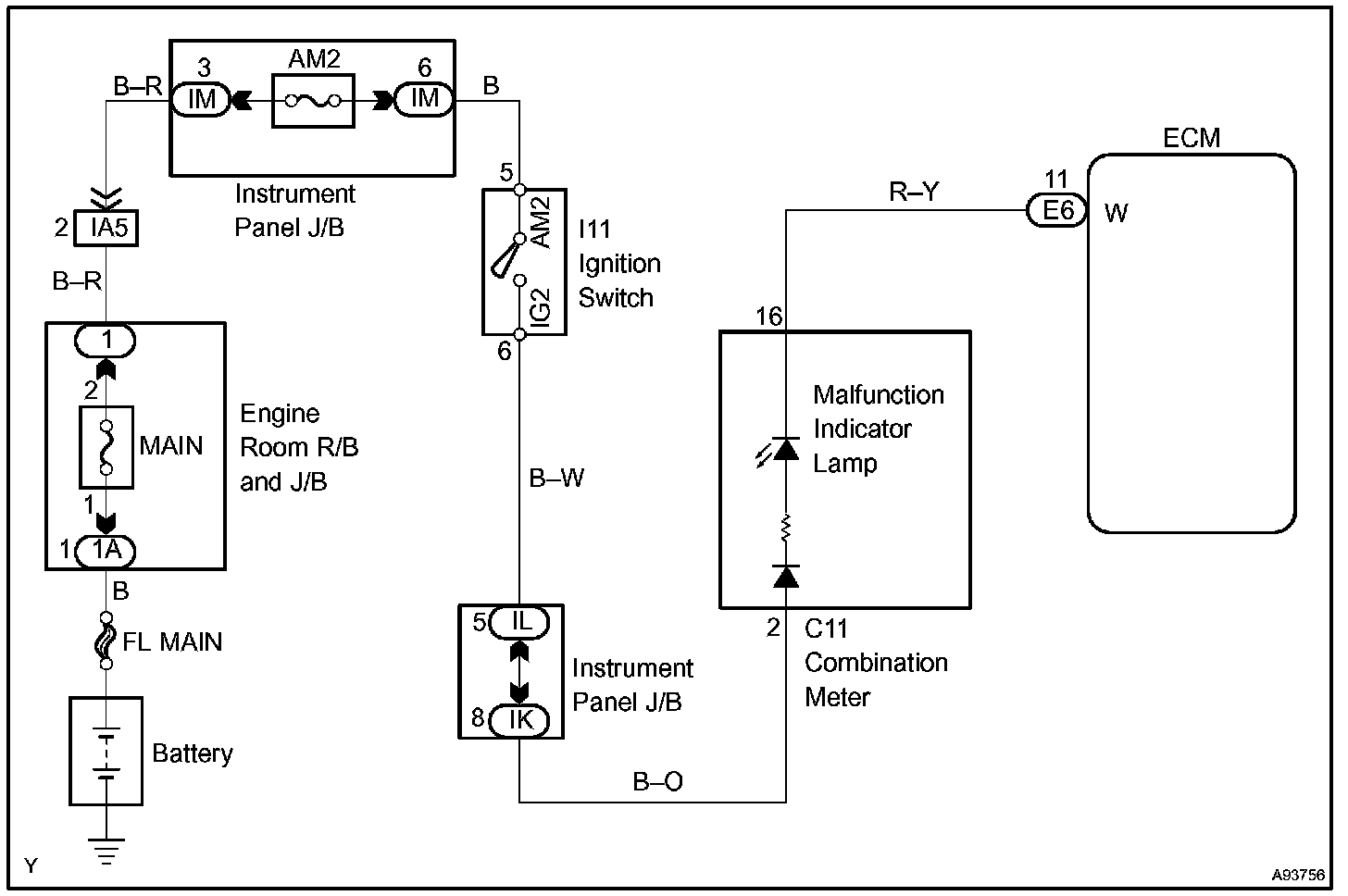 The MIL (Malfunction Indicator Lamp) is used to indicate vehicle malfunction detections by the ECM. By turning the ignition switch to ON, power is supplied to the MIL circuit, and the ECM provides the circuit ground which illuminates the MIL.