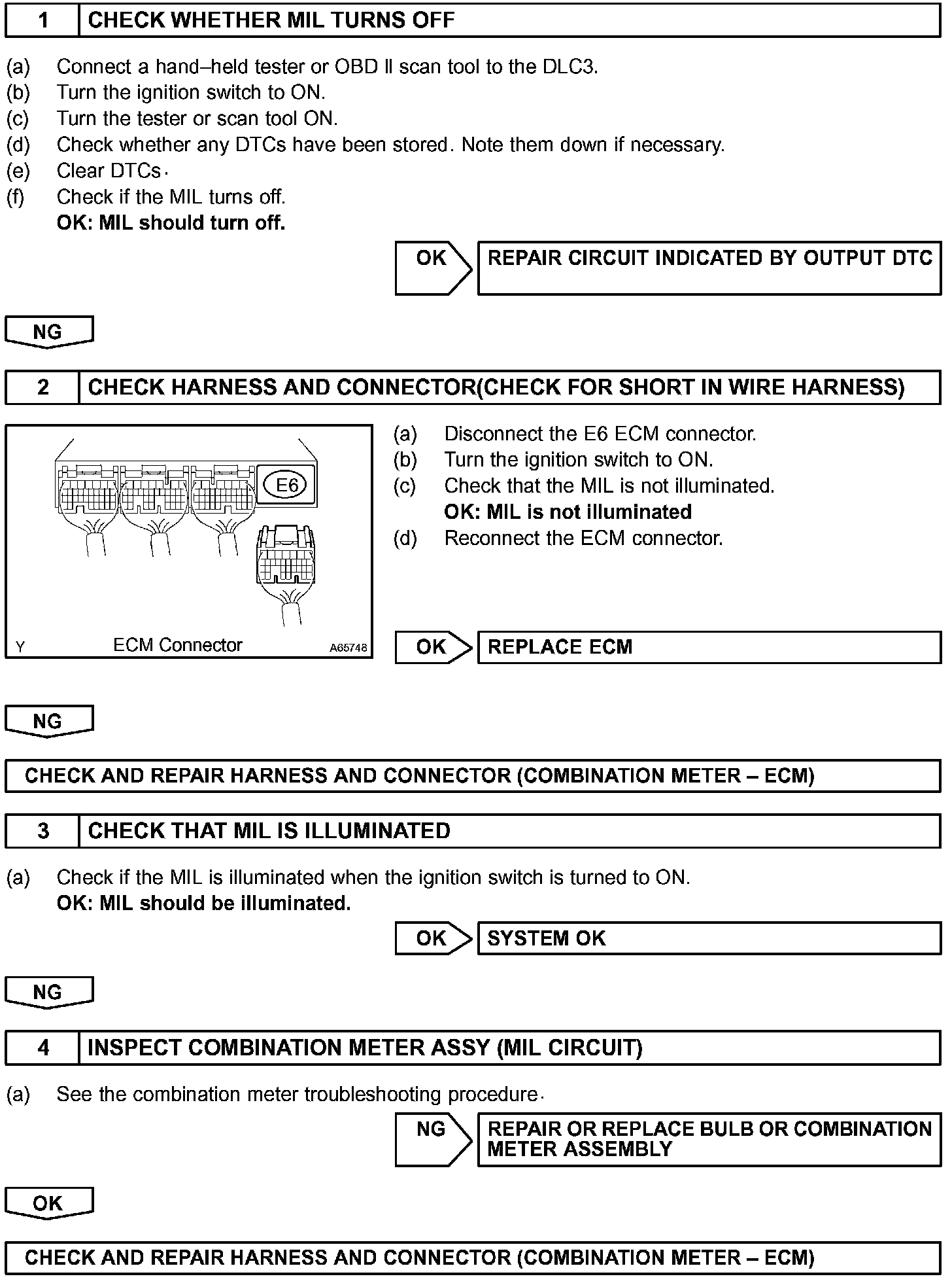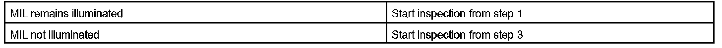 The MIL operation can be checked visually: When the ignition switch is first turned to ON, the MIL should be illuminated and should then turn OFF. If the MIL remains illuminated or is not illuminated, conduct the following troubleshooting procedure using a hand-held tester or OBD II scan tool.