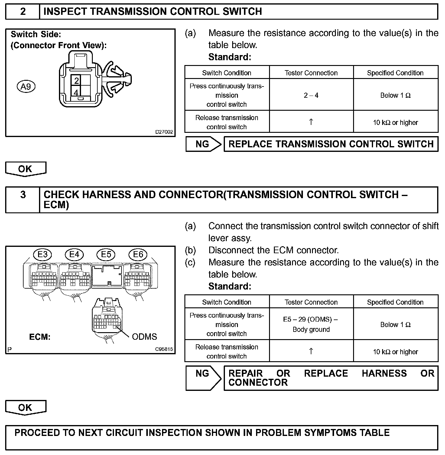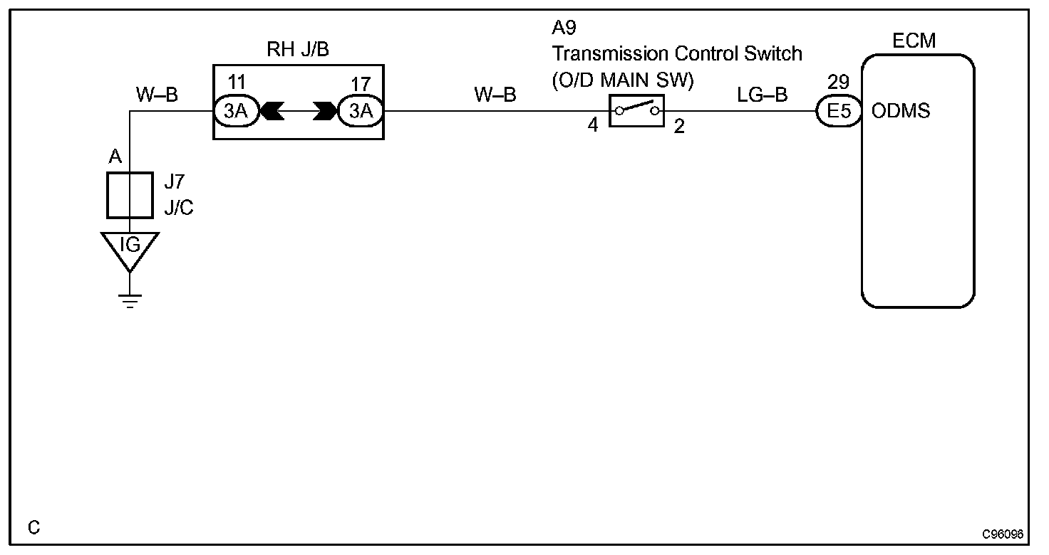 The O/D main switch (transmission control switch) is a momentary type switch. When pressing the O/D main switch, the O/D OFF indicator light lights up and the ECM prohibits shifting into O/D, and when pressing it` once again, the O/D OFF indicator light goes off and the ECM allows shifting into O/D. Turning the IG switch OFF will reset the O/D OFF indicator light.