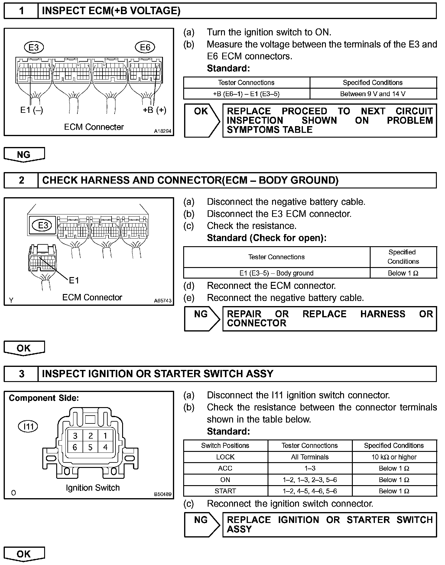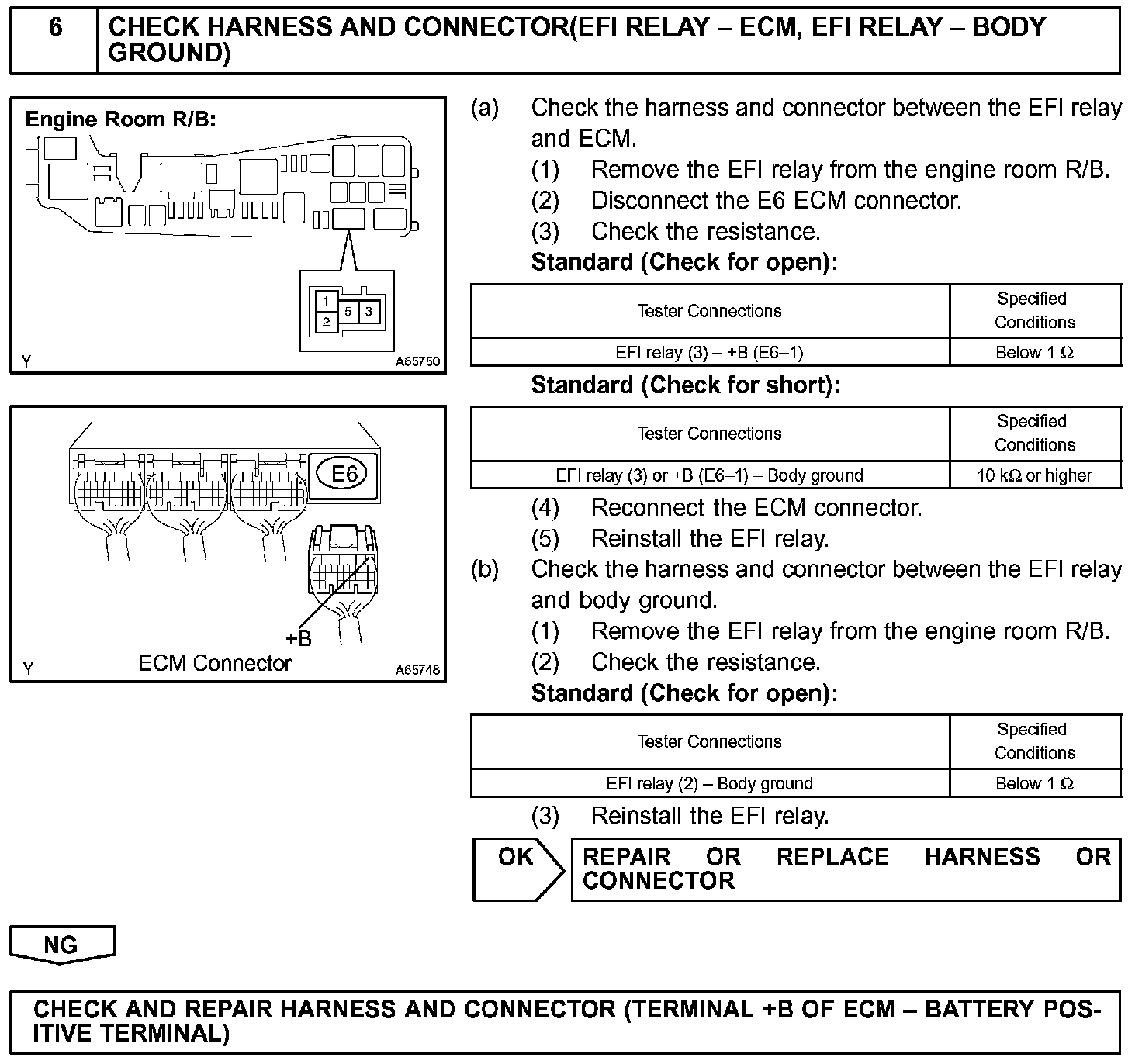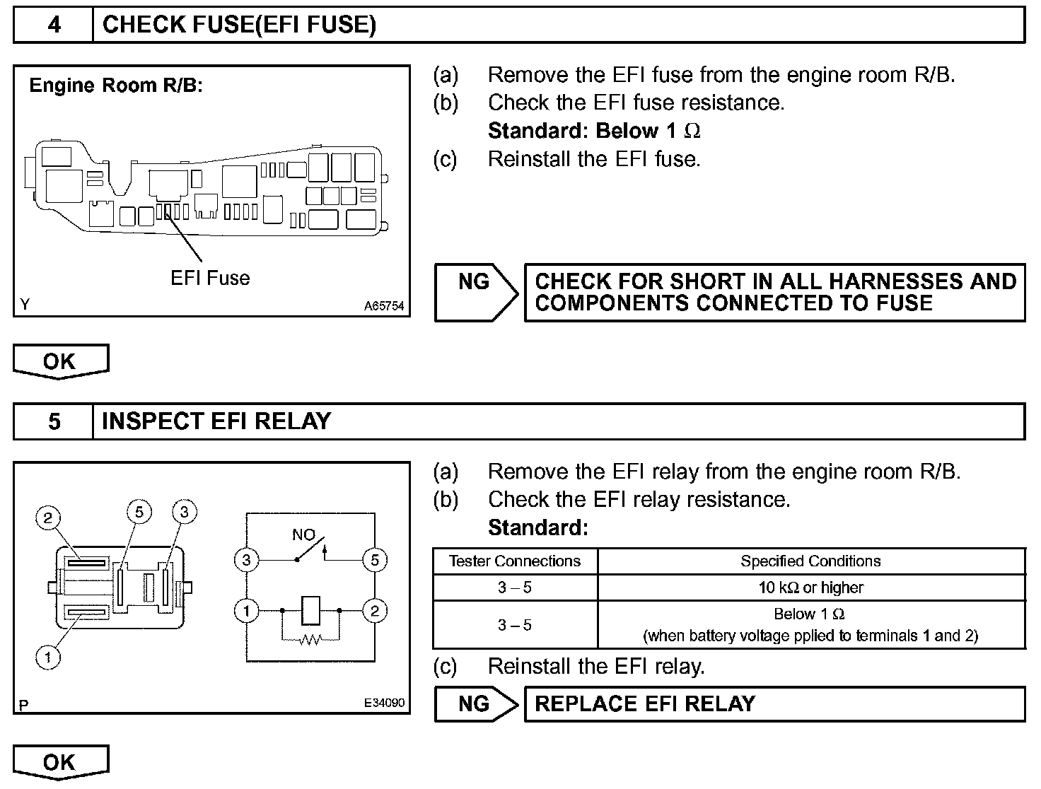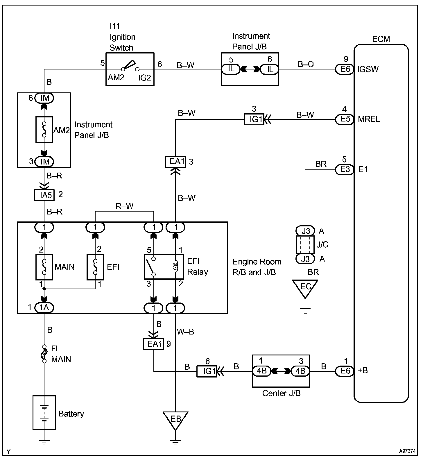 When the ignition switch is turned to ON, the battery voltage is applied to terminal IGSW of the ECM. The ECM MREL output signal causes a current to flow to the coil, closing the contacts of the EFI relay and supplying power to terminal +B of the ECM.