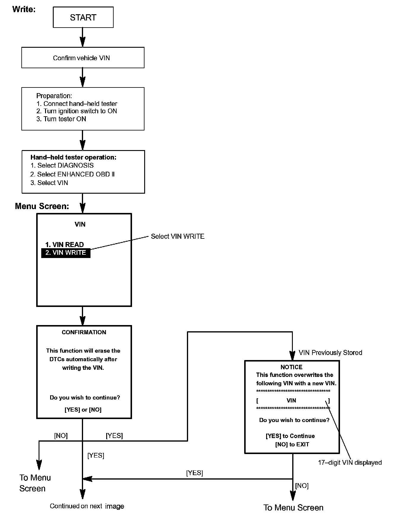 c. Write VIN: Explains the VIN writing process in a flowchart. This process allows the VIN to be input into the ECM. If the ECM is changed, or the VIN and VIN do not match, the VIN can be registered, or overwritten in the ECM by following this procedure.