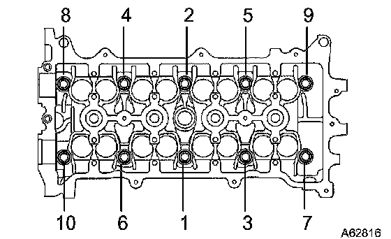 Using a 10 mm bi-hexagon wrench, install and uniformly tighten the 10 cylinder head bolts with the plate washers, in several passes in the sequence shown.