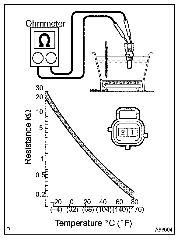 NOTE: If checking the engine coolant temperature sensor in water, be careful not to allow water to intrude into the terminals. After checking, wipe up water on the engine coolant temperature sensor. If the result is not as specified, replace the engine coolant temperature sensor.