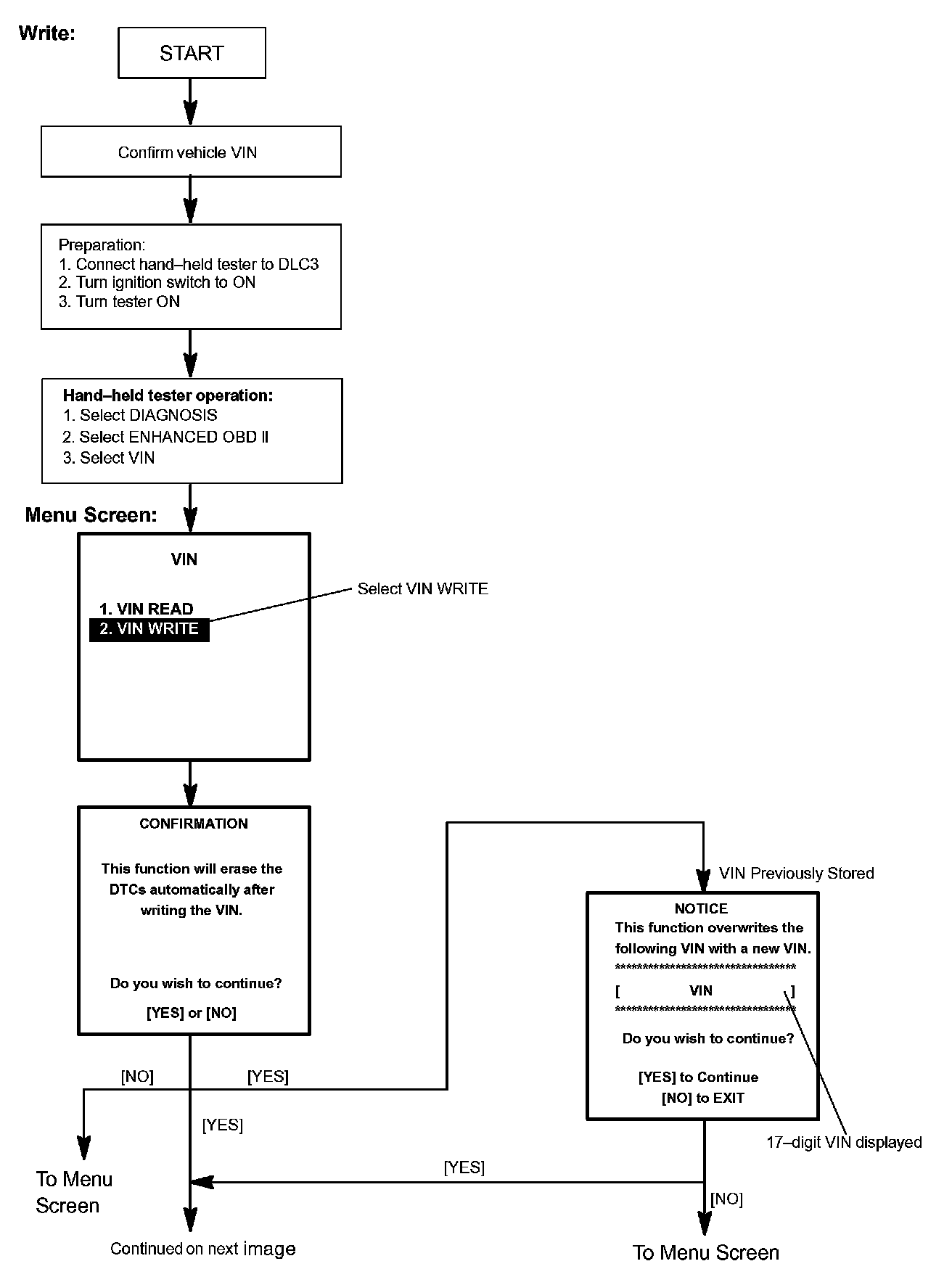 c. Write VIN: Explains the VIN writing process in a flowchart. This process allows the VIN to be input into the ECM. If the ECM is changed, or the VIN and VIN do not match, the VIN can be registered, or overwritten in the ECM by following this procedure.