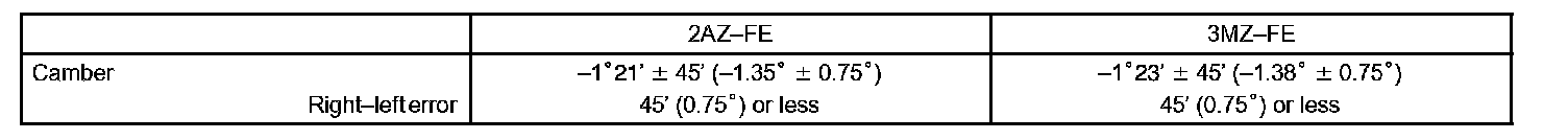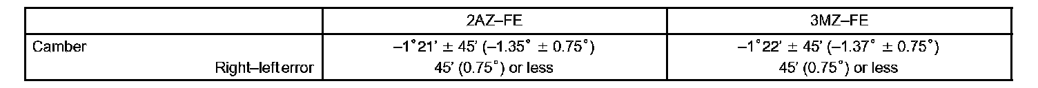 HINT: Camber is not adjustable. If the measurement is not within the specification, inspect the suspension parts for damage and/or wear, and replace them if necessary.