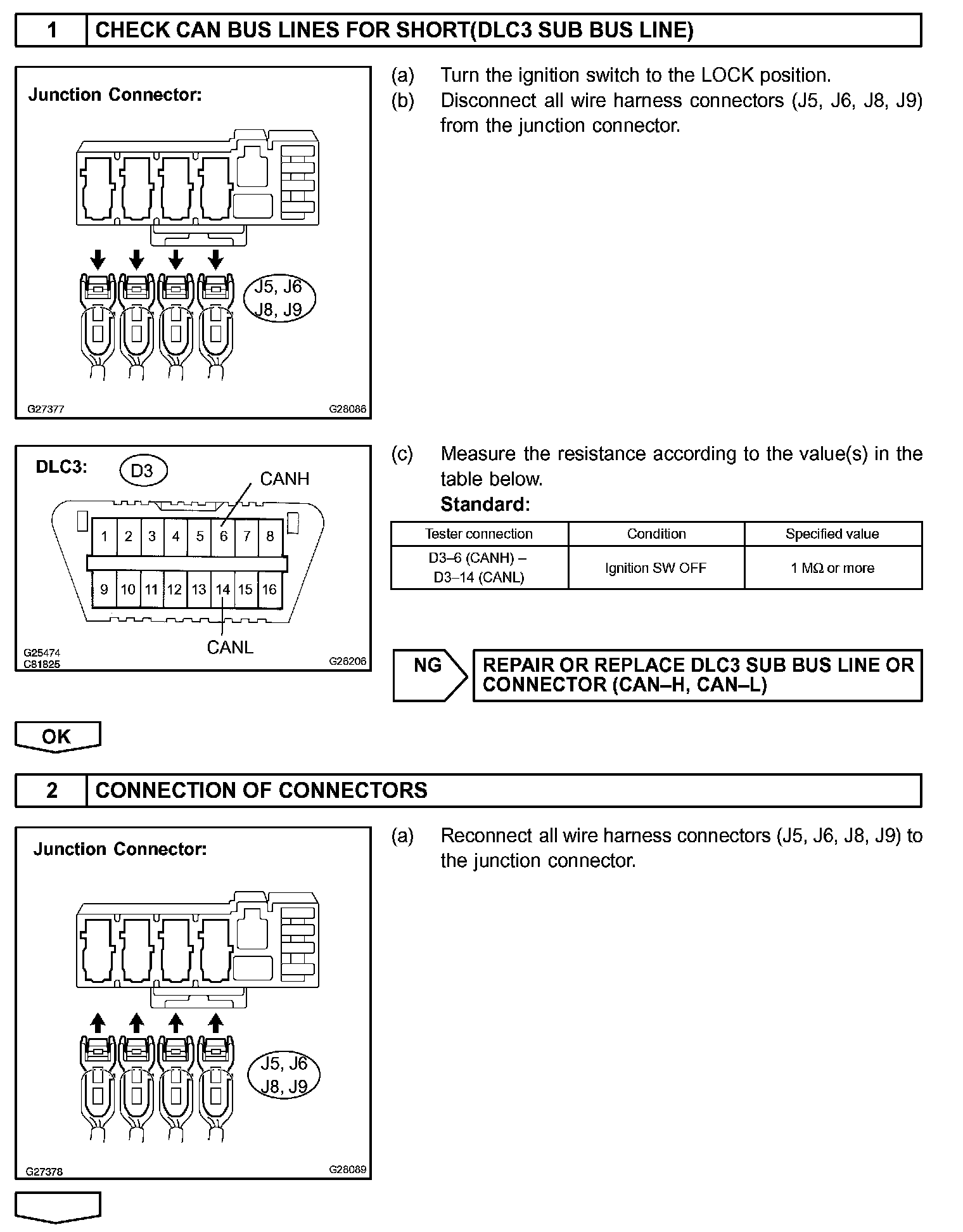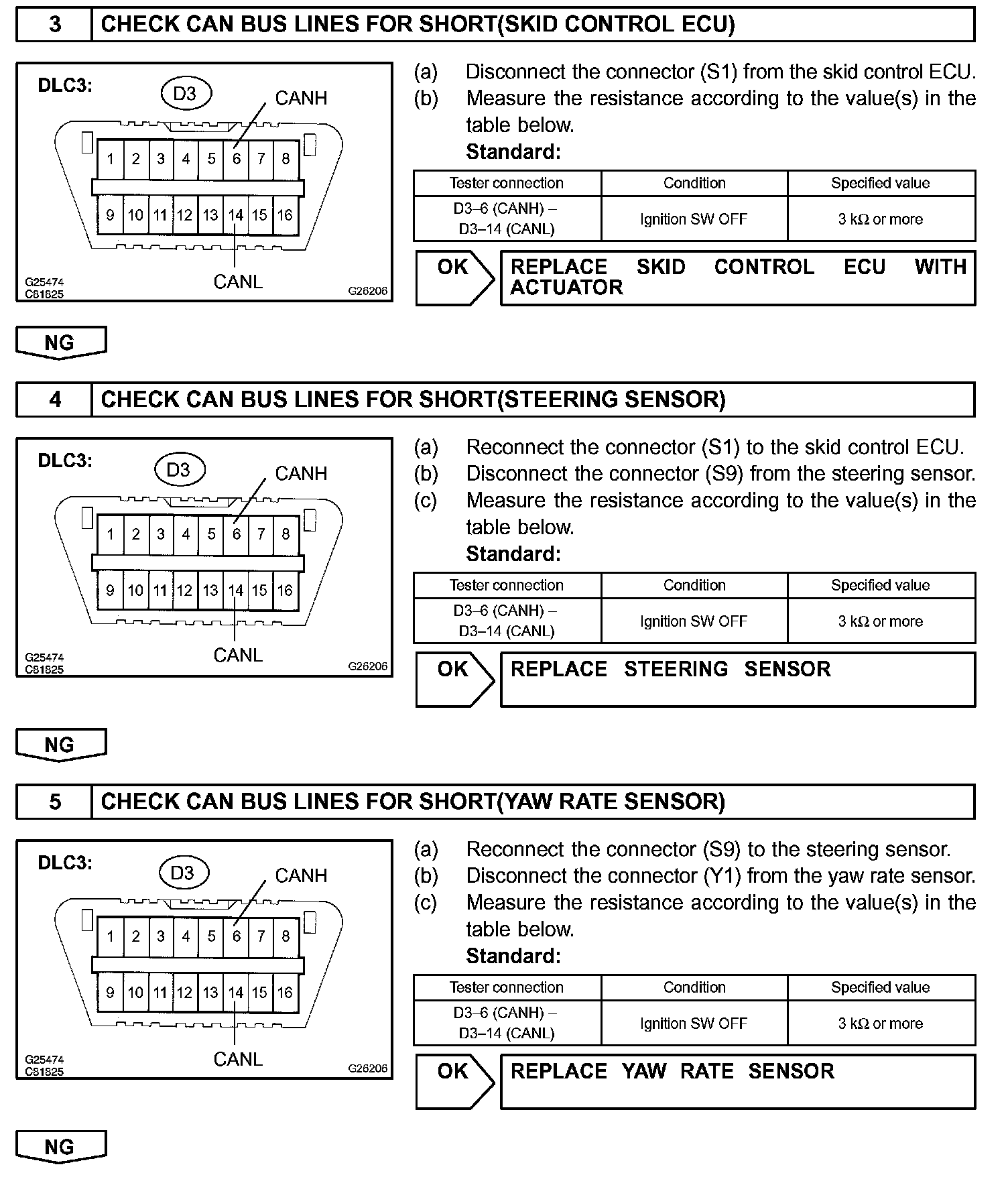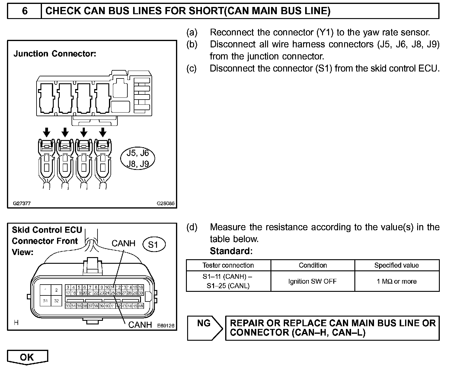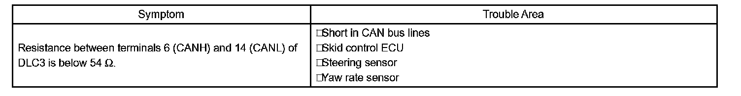 The CAN bus lines are considered to be shorted when the resistance between terminals 6 (CANH) and (CANL) of the DLC3 is below 54 Ohms.