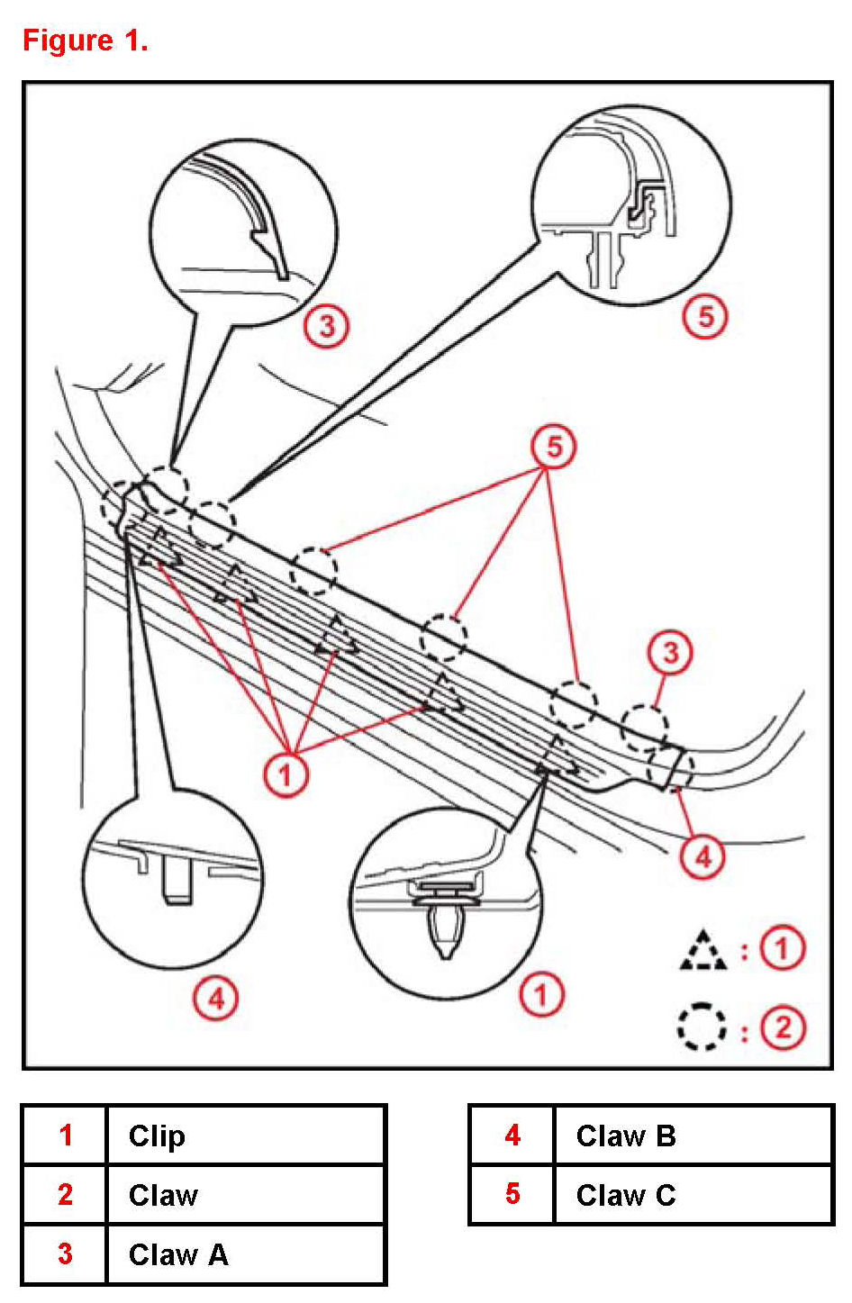 A. Using a plastic pry tool disengage the 2 claws labeled A, 2 claws labeled B, 4 claws labeled C and 5 clips and remove the scuff plate.