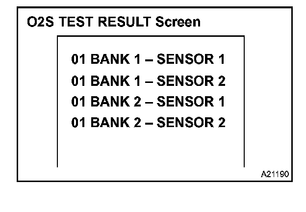 b. On the tester screen, select the following menus: DIAGNOSIS / CARB OBD II / O2S TEST RESULT. A list of the O2S equipped on the vehicle will be displayed.